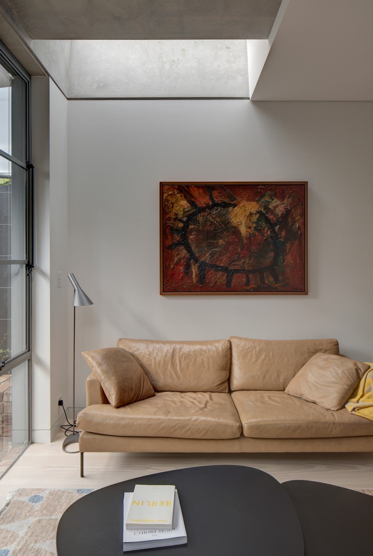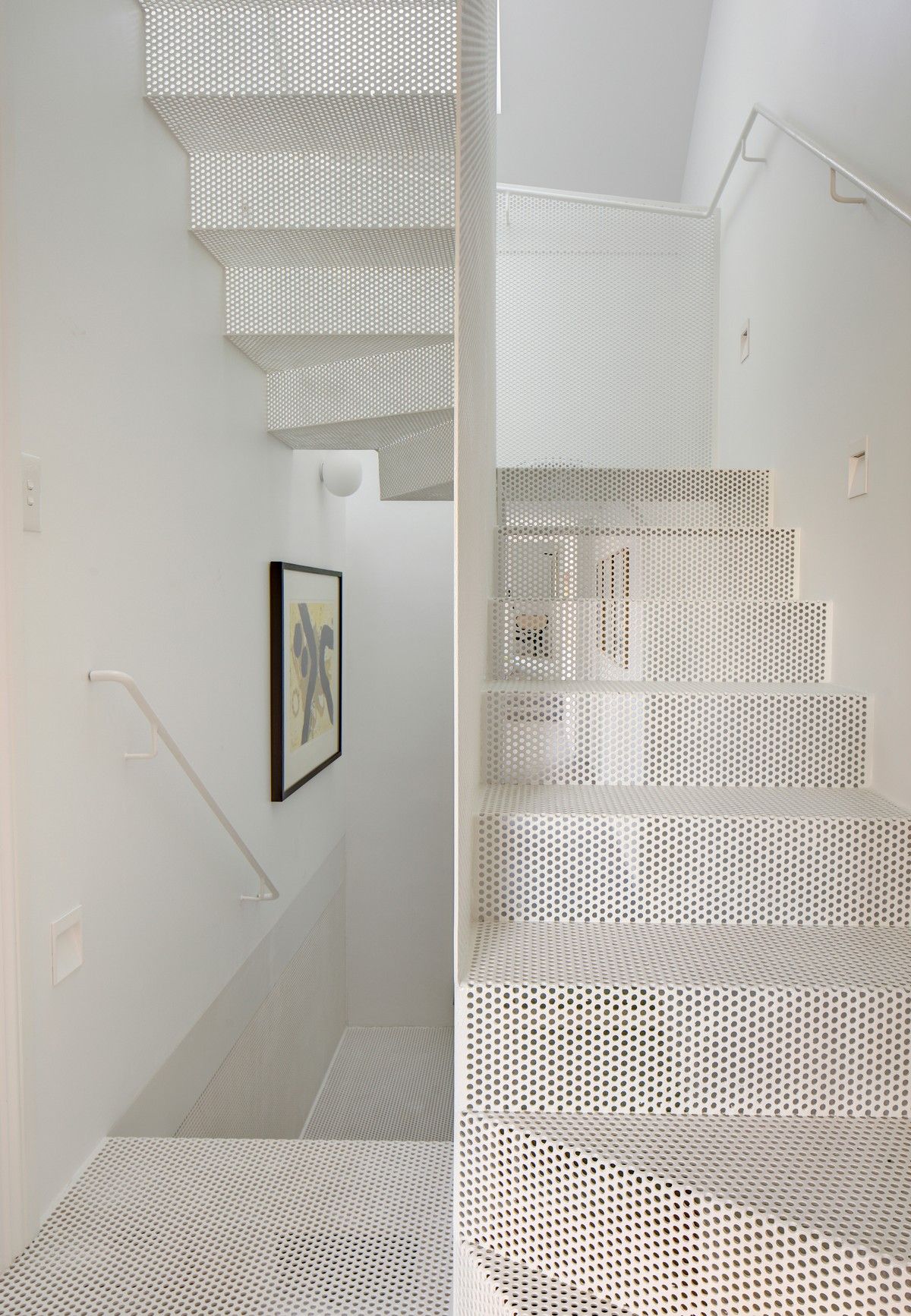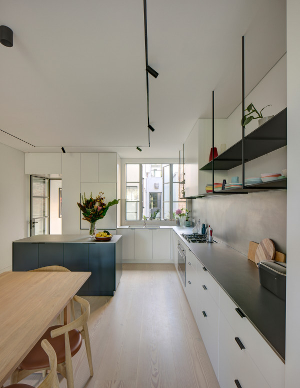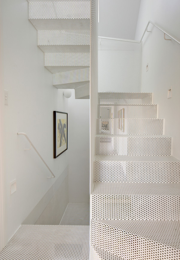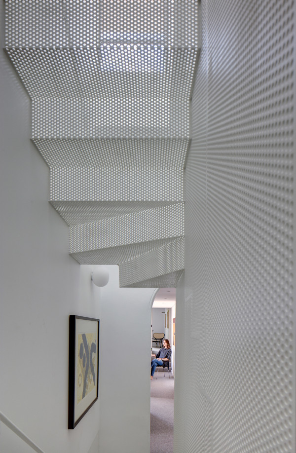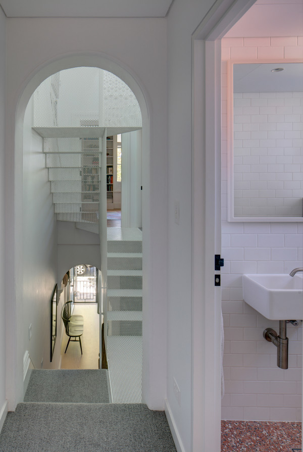 Реконструкция здания была осуществлена под влиянием возможностей, связанных с особенностями участка. Длинный и узкий, ширина его немного более 5 метров, позволила внести следующие коррективы. Были добавлены новые помещения, в числе которых пристройка на 2,5 метра к столовой и рабочий кабинет на чердаке. На верхнем этаже над гаражом, который расположен в задней части участка, была оборудована студия. Обновлены кухня и ванная комната, заменены пол и отделка. Чтобы создать зону для отдыха и развлечений на открытом воздухе, был перепроектирован сад. Общая площадь дома после реконструкции составила 273 квадратных метров.Основное внимание в процессе работы уделялось наполнению пространств естественным светом. Так, существующие окна в кухне были увеличены, чтобы улавливать отраженный свет от выходящего на юг светового колодца. Столовая была наполнена светом за счет окна с подсветкой и потолочного окна. Самой темной частью дома была лестничная клетка, поэтому архитекторы полностью изменили ее дизайн, превратив в светящееся скульптурное пространство. Новая лестница, соединяющая первый этаж со студией на чердаке, выполнена из перфорированного металла, который позволяет дневному свету проникать из рабочего окна в крыше на первый этаж.В проекте использованы материалы нейтральной палитры. Новая пристройка выполнена из бетона, широкие половицы изготовлены из древесины пихты Дугласа, лестница - из перфорированного металла. В ванных комнатах пол покрыт плиткой террацо, которая идеально сочетается с каменными столешницами умывальника и мебелью цвета шалфея. Элегантная кухня со столешницей из нержавеющей стали и встроенной раковиной наполнена уютом и комфортом.Система освещения выполнена в минималистичном стиле. Потолочные даунлайты и светильники на гибких магнитных треках на кухне и в столовой позволяют расставить необходимые акценты.