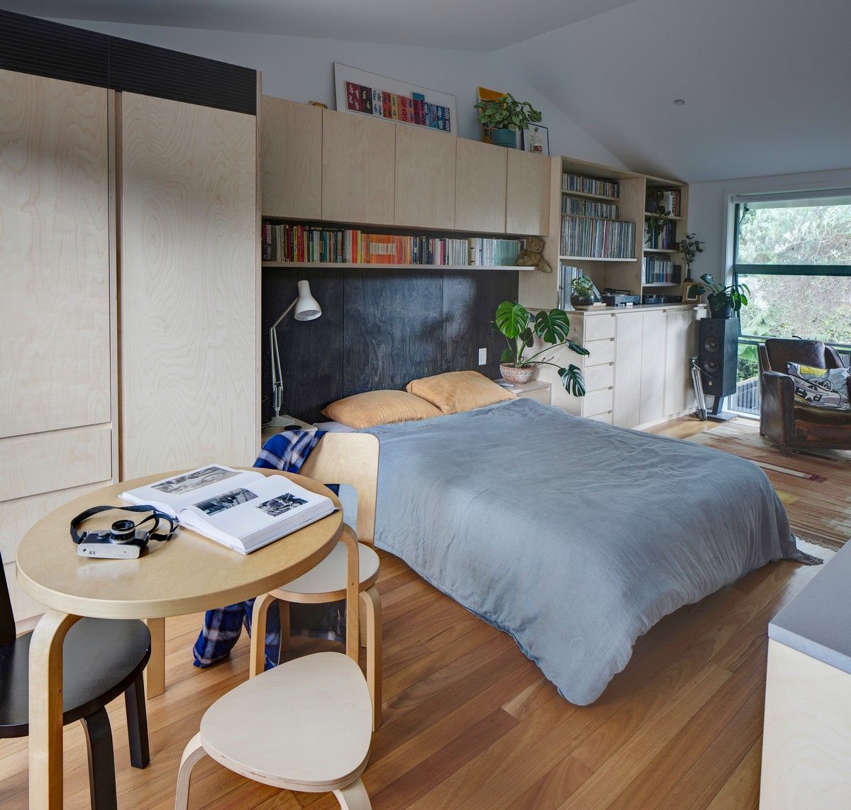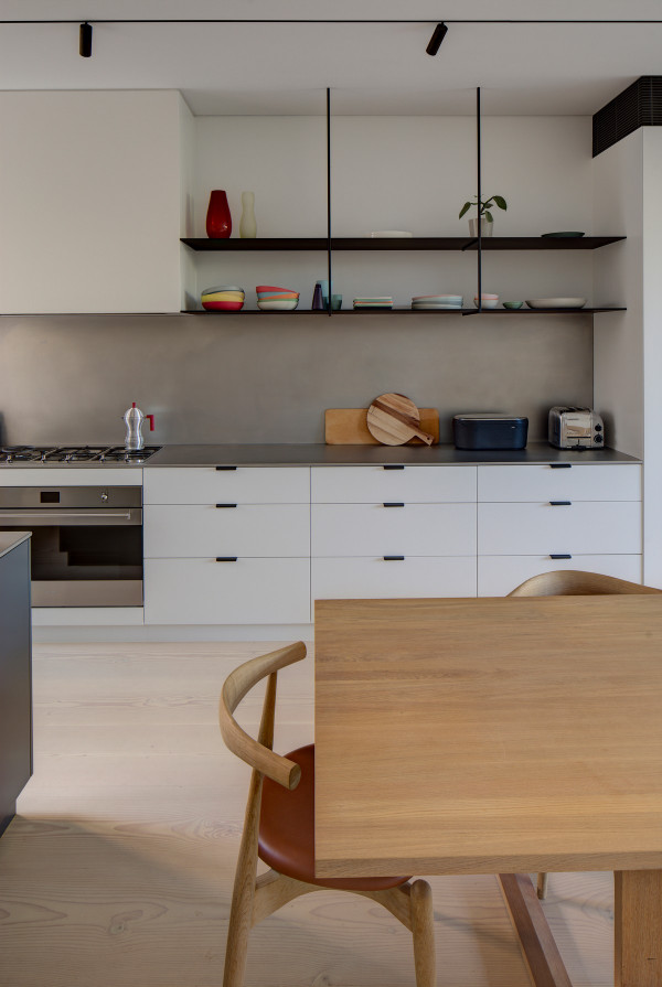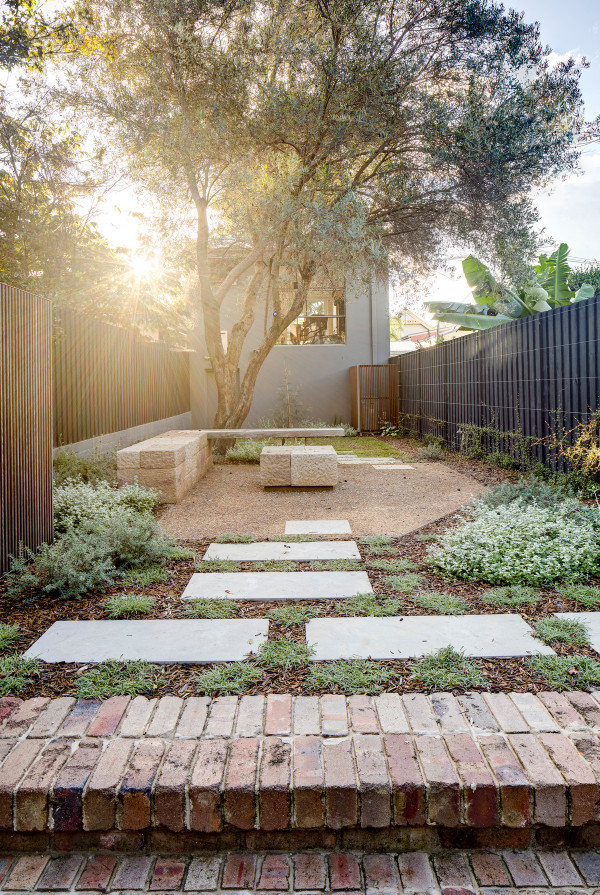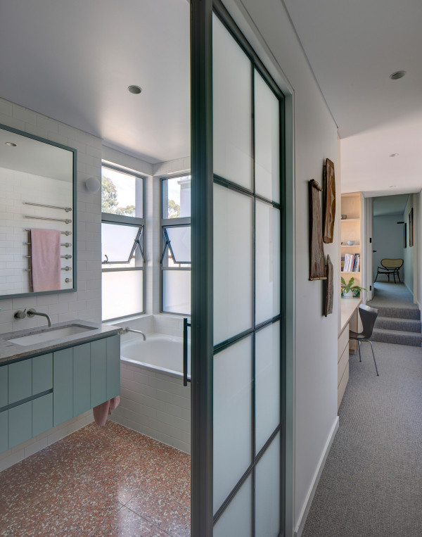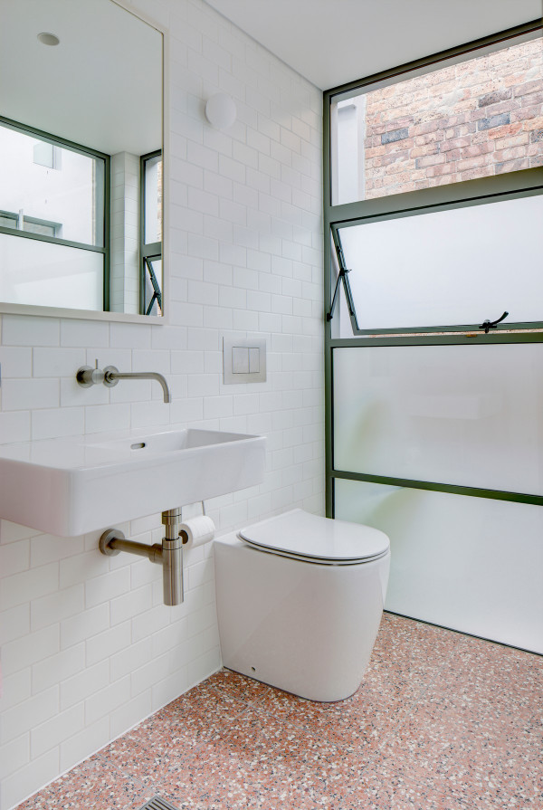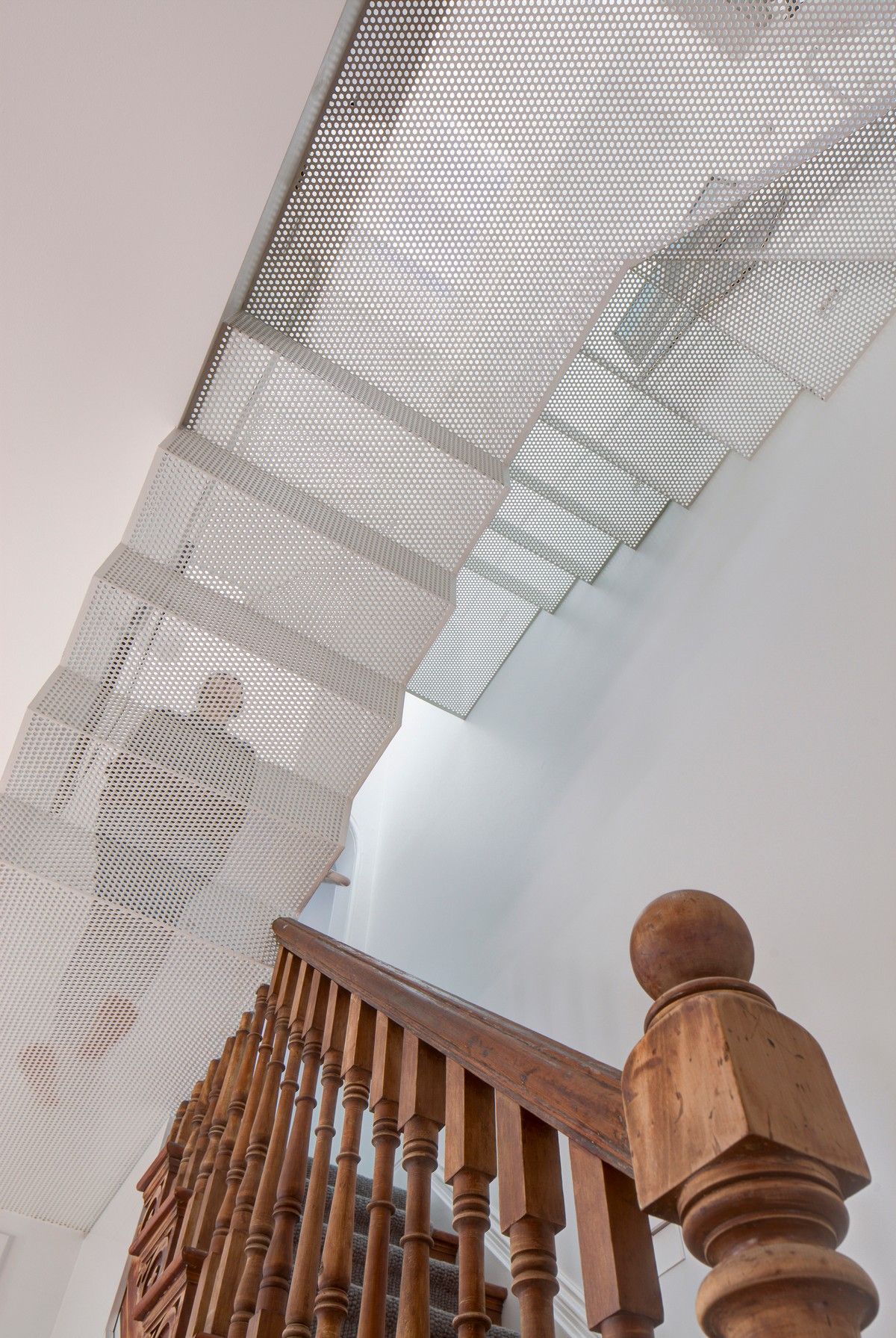 Реконструкция здания была осуществлена под влиянием возможностей, связанных с особенностями участка. Длинный и узкий, ширина его немного более 5 метров, позволила внести следующие коррективы. Были добавлены новые помещения, в числе которых пристройка на 2,5 метра к столовой и рабочий кабинет на чердаке. На верхнем этаже над гаражом, который расположен в задней части участка, была оборудована студия. Обновлены кухня и ванная комната, заменены пол и отделка. Чтобы создать зону для отдыха и развлечений на открытом воздухе, был перепроектирован сад. Общая площадь дома после реконструкции составила 273 квадратных метров.Основное внимание в процессе работы уделялось наполнению пространств естественным светом. Так, существующие окна в кухне были увеличены, чтобы улавливать отраженный свет от выходящего на юг светового колодца. Столовая была наполнена светом за счет окна с подсветкой и потолочного окна. Самой темной частью дома была лестничная клетка, поэтому архитекторы полностью изменили ее дизайн, превратив в светящееся скульптурное пространство. Новая лестница, соединяющая первый этаж со студией на чердаке, выполнена из перфорированного металла, который позволяет дневному свету проникать из рабочего окна в крыше на первый этаж.В проекте использованы материалы нейтральной палитры. Новая пристройка выполнена из бетона, широкие половицы изготовлены из древесины пихты Дугласа, лестница - из перфорированного металла. В ванных комнатах пол покрыт плиткой террацо, которая идеально сочетается с каменными столешницами умывальника и мебелью цвета шалфея. Элегантная кухня со столешницей из нержавеющей стали и встроенной раковиной наполнена уютом и комфортом.Система освещения выполнена в минималистичном стиле. Потолочные даунлайты и светильники на гибких магнитных треках на кухне и в столовой позволяют расставить необходимые акценты.