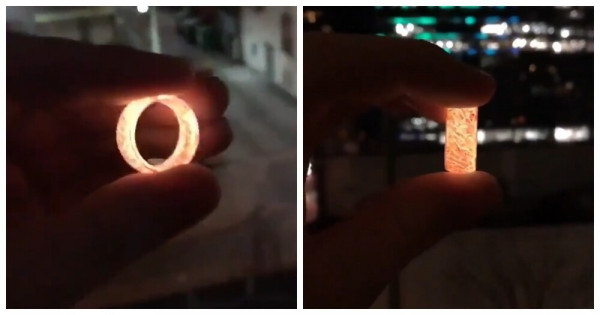 Это кольцо изготовлено из эпоксидной смолы, смешанной с порошком алюмината стронция - вещества, способного накапливать световую энергию. После воздействия света материал медленно излучает её в виде мягкого свечения в течение нескольких часов.