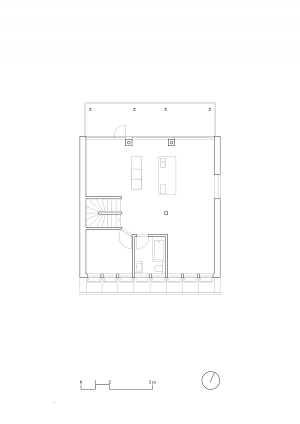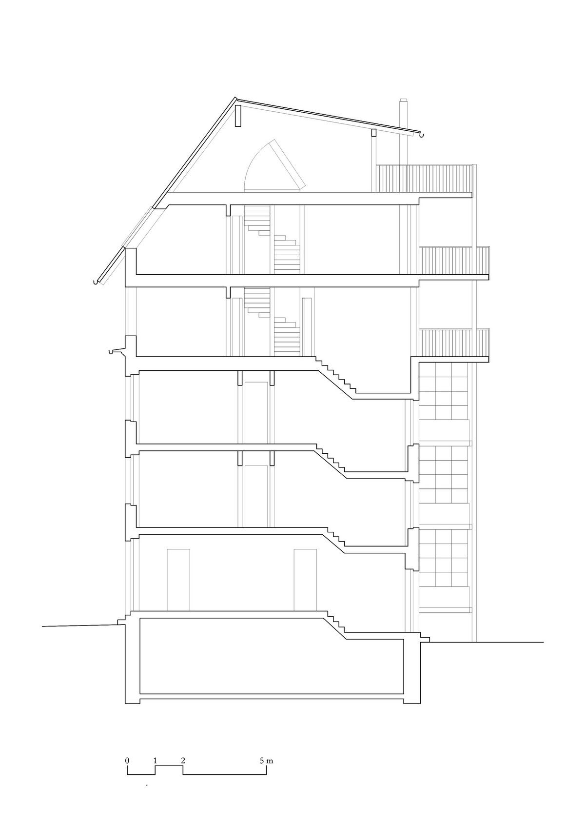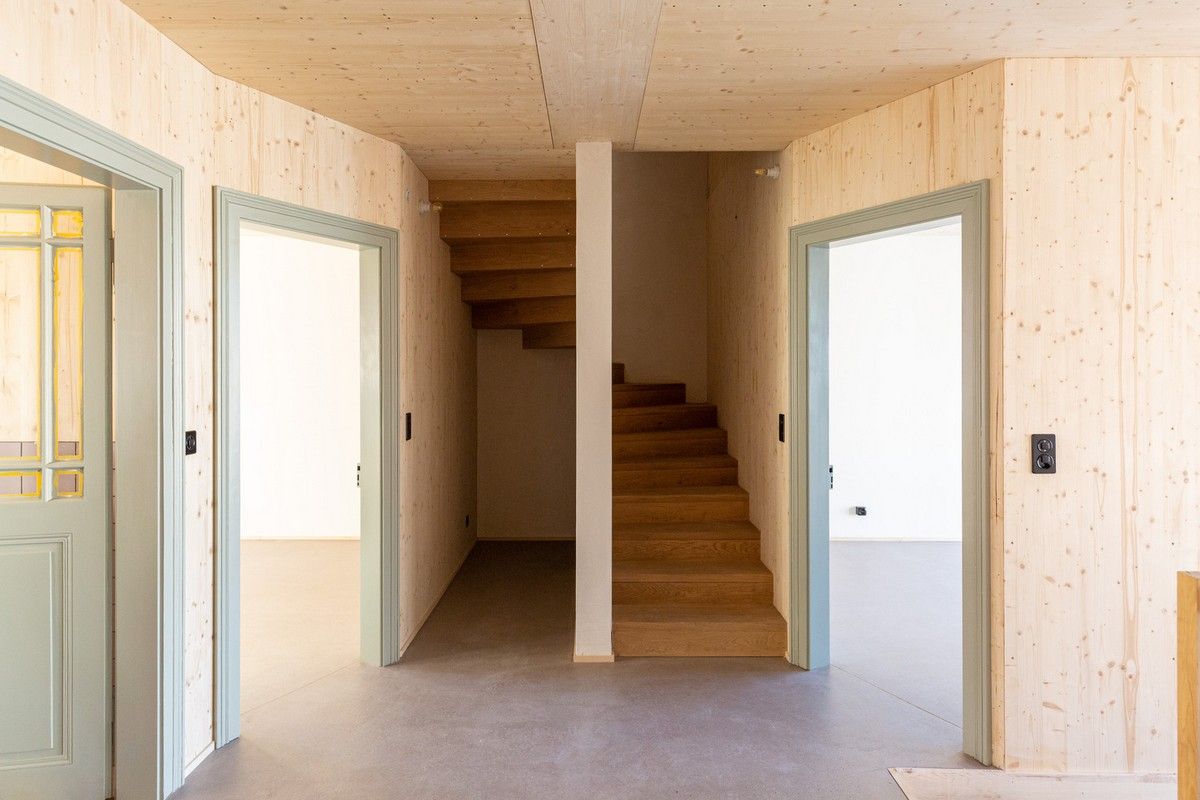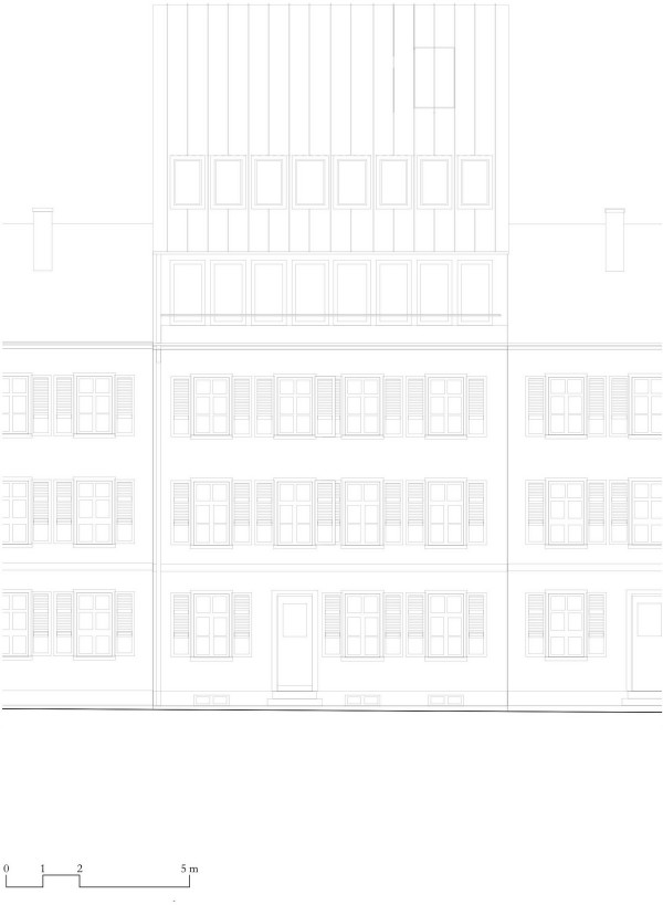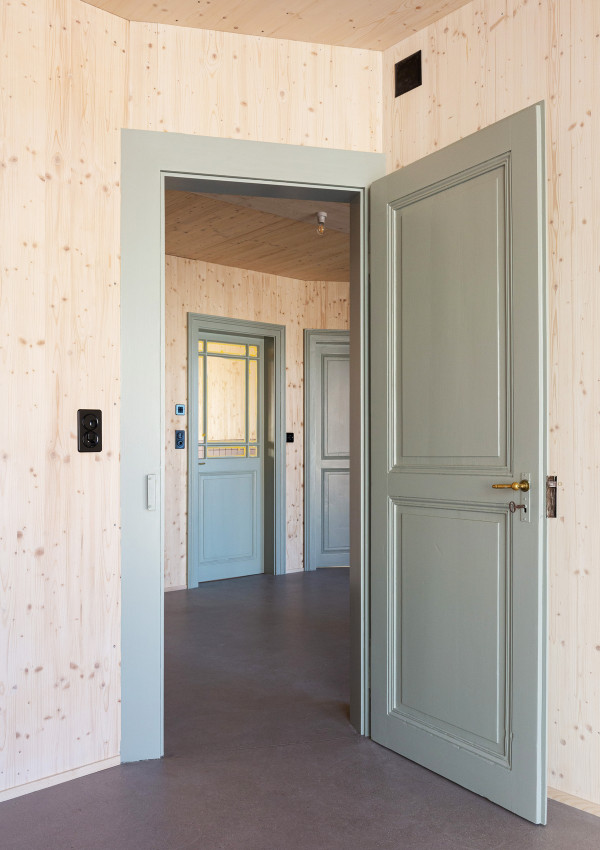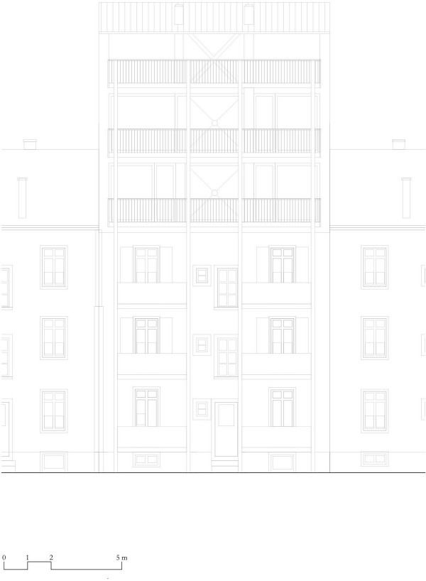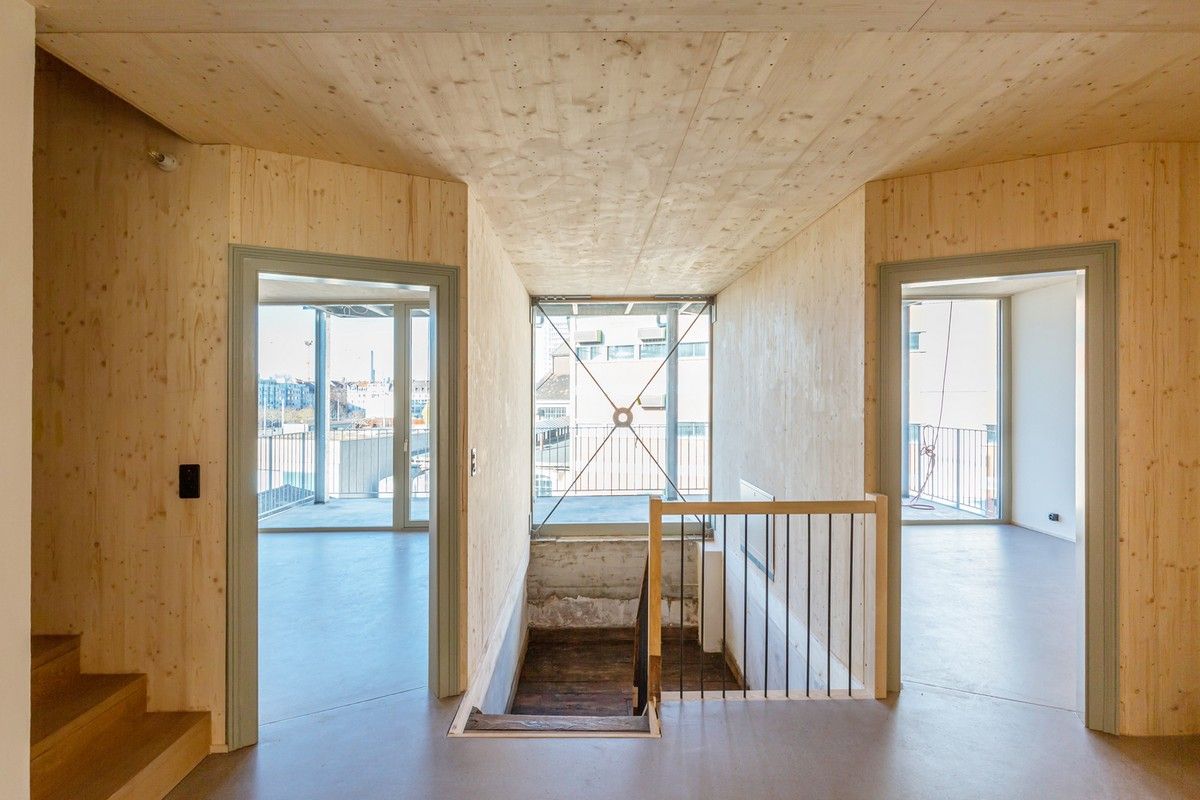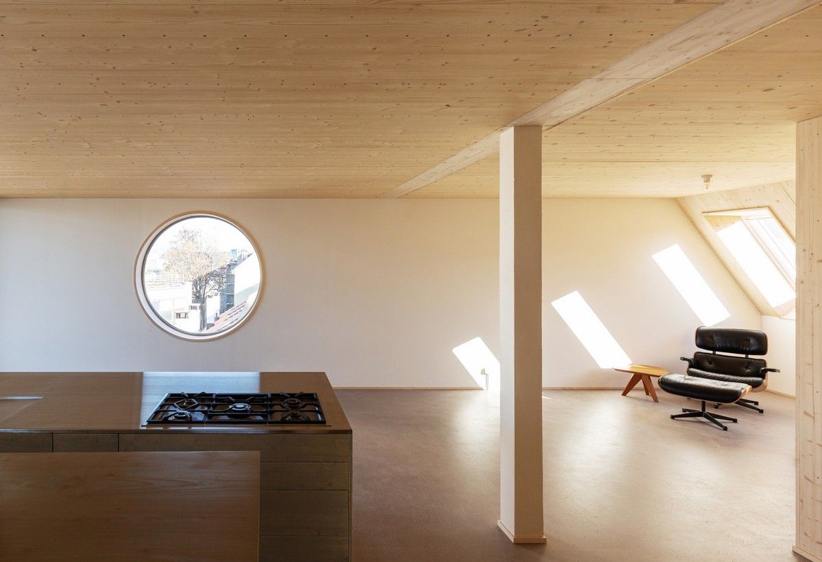 Архитекторами была использована радикальная концепция надстройки этажей к существующему зданию, способствующая реализации идеи внутреннего уплотнения города и рассматривая как экологический вариант застройки. В процессе работы авторами проекта были максимально сохранены ценные строительные ресурсы старого дома и доступная жилая площадь, а новая семейная квартира со стороны Вассерштрассе выглядит как пристройка к крыше. Благодаря тому, что существующие архитектурные элементы, в том числе карнизы на фасадах, были сохранены и отреставрированы, новая часть дома идеально дополнила существующее здание и вписалась в архитектурный ансамбль соседних строений.Пристройка с дизайнерским деревянным фасадом и крутой двухэтажной скатной крышей с тремя новыми уровнями балконов открыта в сторону реки. Боковые противопожарные стены, имеющие деревянную конструкцию покрыты специальной известково-цементной структурной штукатуркой, а существующие внешние стены окрашены. В сторону Вассерштрассе пристройка имеет более закрытый вид. Высокая скатная крыша простирается на два этажа, а мансардный этаж с восемью вертикальными окнами действует как промежуточное звено между крышей и старым домом. Металлическая фальцевая кровля четко отделена от соседних черепичных крыш и отсылает к расположенному рядом промышленному контексту теплоцентрали. Проемы в крыше имеют конструкционный характер. Так, восемь световых люков в крыше воспроизводят положение стропил, а непрозрачный световой люк выборочно открывает кровельное пространство.Типология пристройки складывается из планировки помещений здания. Существующая в подъезде лестница ведет в расположенный по центру этажа центральный восьмиугольный холл, который является входной зоной в новый мезонет. Отсюда можно попасть во все помещения точечно-симметричного плана этажа. Вокруг холла в каждом из четырех углов расположены спальни, между которыми находятся лестница, ванная комната и гардероб. Независимая от подъезда полувинтовая лестница ведет к западной противопожарной стене и соединяет все уровни новой квартиры. На втором этаже оборудована социальная зона открытой планировки, которая объединяет гостиную, столовую и кухню. Третий уровень представляет собой необогреваемое пространство под крышей, которое функционирует как открытое дополнительное помещение и климатический буфер в духе кровельных ферм периода Gründerzeit.В проекте были использованы долговечные природные материалы, многие из которых имеют повторное использование, доминирующим при этом, является натуральное дерево. Стены и потолок квартиры облицованы трехслойными еловыми панелями теплого красновато-серого оттенка, которые эффектно контрастируют с полом, выполненным из отшлифованного ангидрита.Часть внутренних деревянных дверей была сохранена и отреставрирована, часть заменена на новые из-за повышенных требований к противопожарной защите здания. Изделия были выкрашены масляной краской в серый цвет. Изюминой новой квартиры является круглое окно в восточной пожарной стене, которое очень нравится детям.Для обеспечения сейсмостойкости здания все нагрузки передаются через балки и стеновые плиты на два брандмауэра. В подвале нагрузку пристройки принимают на себя дополнительно армированные линейные фундамент