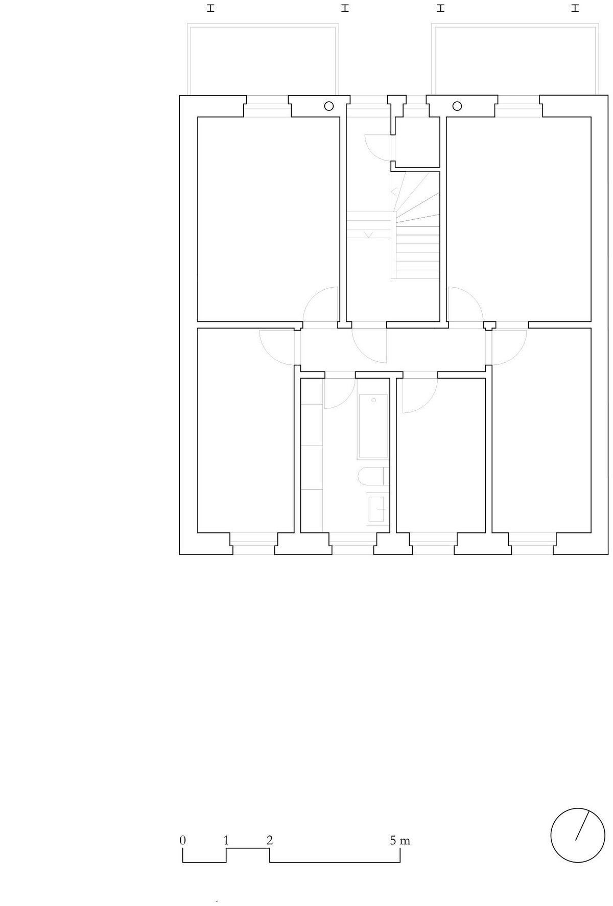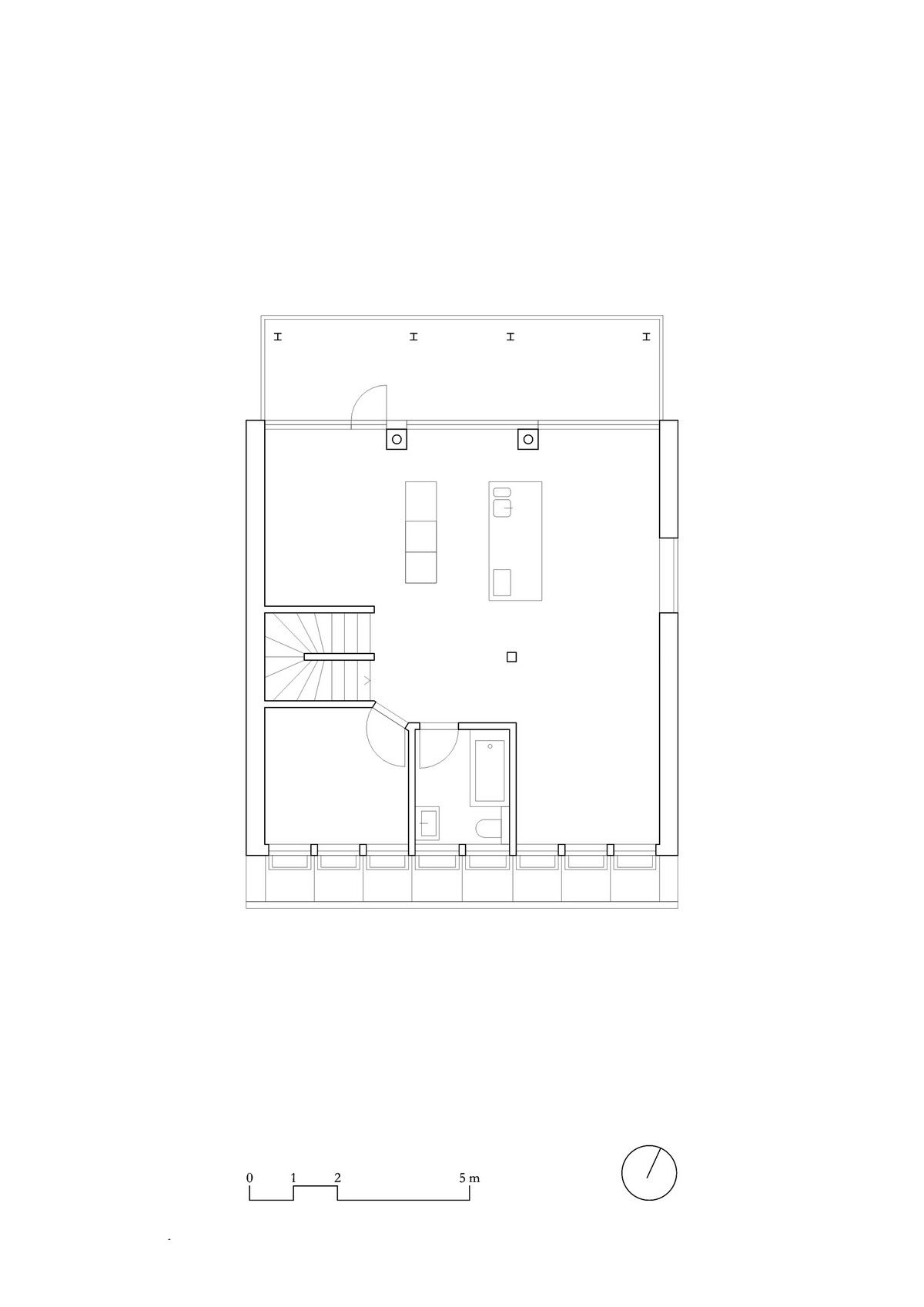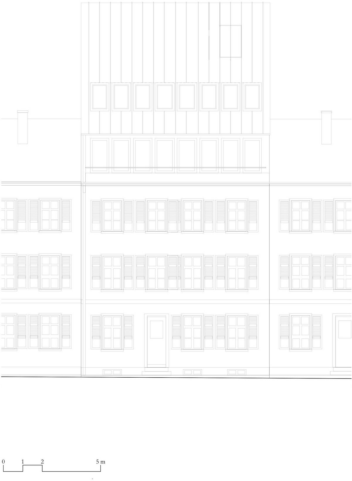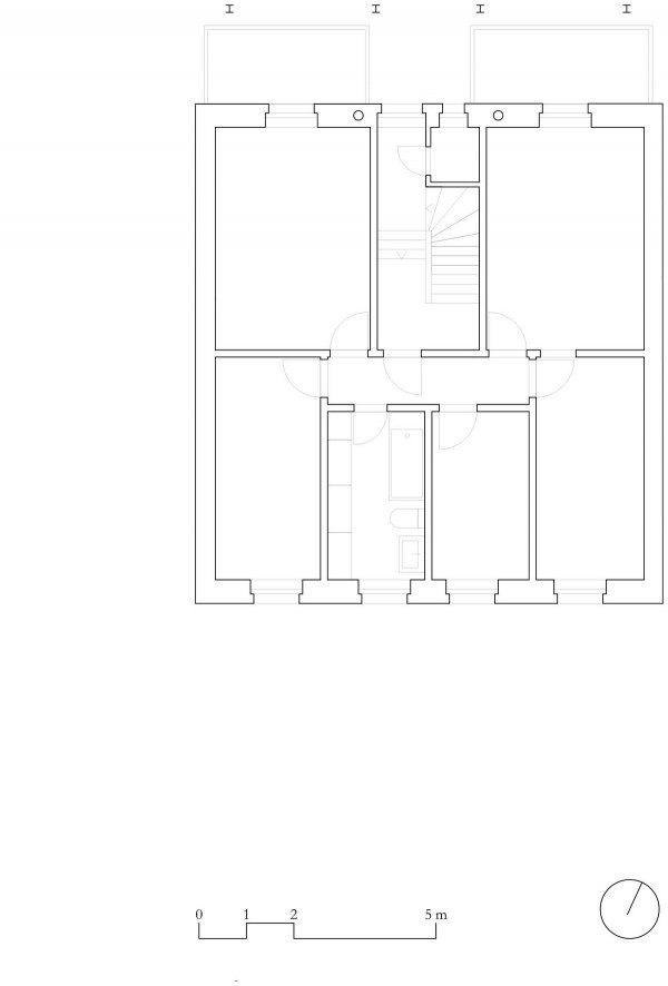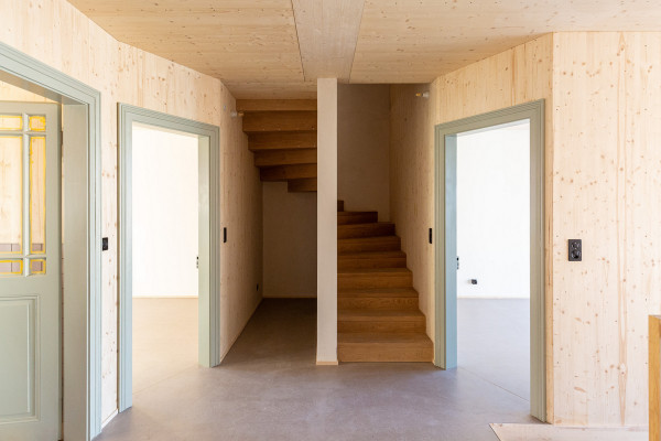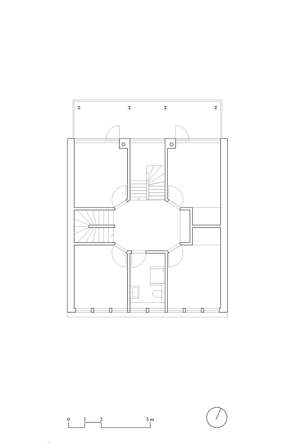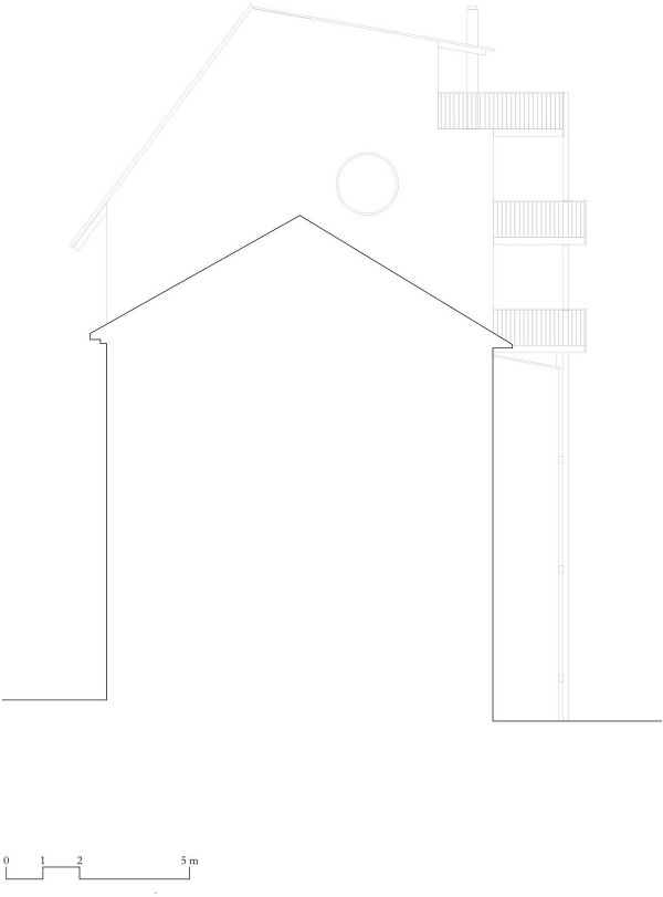 Архитекторами была использована радикальная концепция надстройки этажей к существующему зданию, способствующая реализации идеи внутреннего уплотнения города и рассматривая как экологический вариант застройки. В процессе работы авторами проекта были максимально сохранены ценные строительные ресурсы старого дома и доступная жилая площадь, а новая семейная квартира со стороны Вассерштрассе выглядит как пристройка к крыше. Благодаря тому, что существующие архитектурные элементы, в том числе карнизы на фасадах, были сохранены и отреставрированы, новая часть дома идеально дополнила существующее здание и вписалась в архитектурный ансамбль соседних строений.Пристройка с дизайнерским деревянным фасадом и крутой двухэтажной скатной крышей с тремя новыми уровнями балконов открыта в сторону реки. Боковые противопожарные стены, имеющие деревянную конструкцию покрыты специальной известково-цементной структурной штукатуркой, а существующие внешние стены окрашены. В сторону Вассерштрассе пристройка имеет более закрытый вид. Высокая скатная крыша простирается на два этажа, а мансардный этаж с восемью вертикальными окнами действует как промежуточное звено между крышей и старым домом. Металлическая фальцевая кровля четко отделена от соседних черепичных крыш и отсылает к расположенному рядом промышленному контексту теплоцентрали. Проемы в крыше имеют конструкционный характер. Так, восемь световых люков в крыше воспроизводят положение стропил, а непрозрачный световой люк выборочно открывает кровельное пространство.Типология пристройки складывается из планировки помещений здания. Существующая в подъезде лестница ведет в расположенный по центру этажа центральный восьмиугольный холл, который является входной зоной в новый мезонет. Отсюда можно попасть во все помещения точечно-симметричного плана этажа. Вокруг холла в каждом из четырех углов расположены спальни, между которыми находятся лестница, ванная комната и гардероб. Независимая от подъезда полувинтовая лестница ведет к западной противопожарной стене и соединяет все уровни новой квартиры. На втором этаже оборудована социальная зона открытой планировки, которая объединяет гостиную, столовую и кухню. Третий уровень представляет собой необогреваемое пространство под крышей, которое функционирует как открытое дополнительное помещение и климатический буфер в духе кровельных ферм периода Gründerzeit.В проекте были использованы долговечные природные материалы, многие из которых имеют повторное использование, доминирующим при этом, является натуральное дерево. Стены и потолок квартиры облицованы трехслойными еловыми панелями теплого красновато-серого оттенка, которые эффектно контрастируют с полом, выполненным из отшлифованного ангидрита.Часть внутренних деревянных дверей была сохранена и отреставрирована, часть заменена на новые из-за повышенных требований к противопожарной защите здания. Изделия были выкрашены масляной краской в серый цвет. Изюминой новой квартиры является круглое окно в восточной пожарной стене, которое очень нравится детям.Для обеспечения сейсмостойкости здания все нагрузки передаются через балки и стеновые плиты на два брандмауэра. В подвале нагрузку пристройки принимают на себя дополнительно армированные линейные фундамент