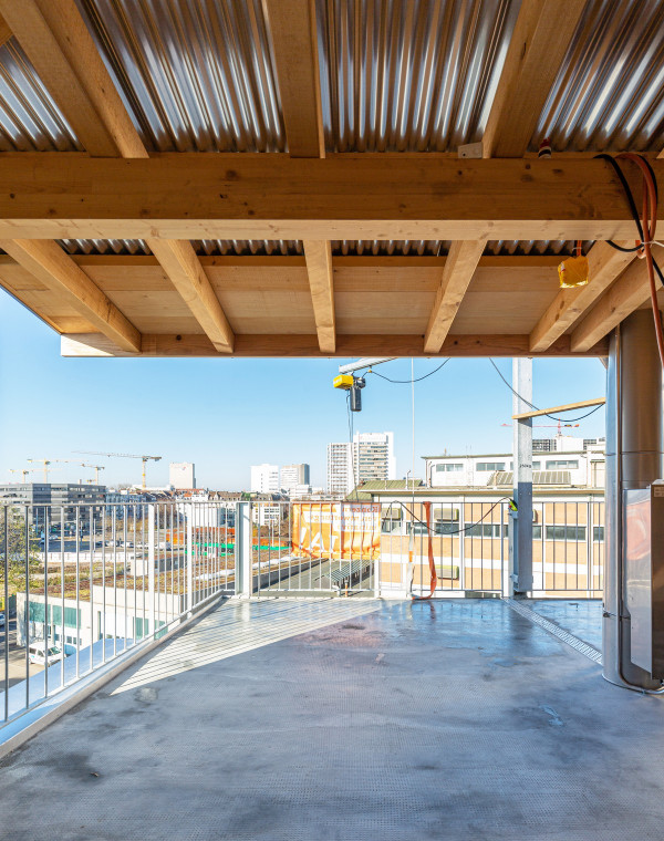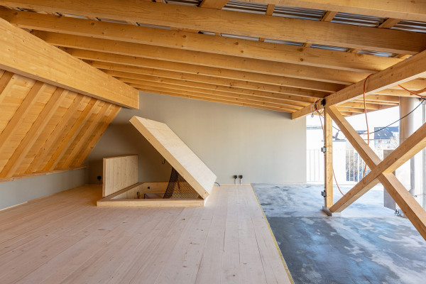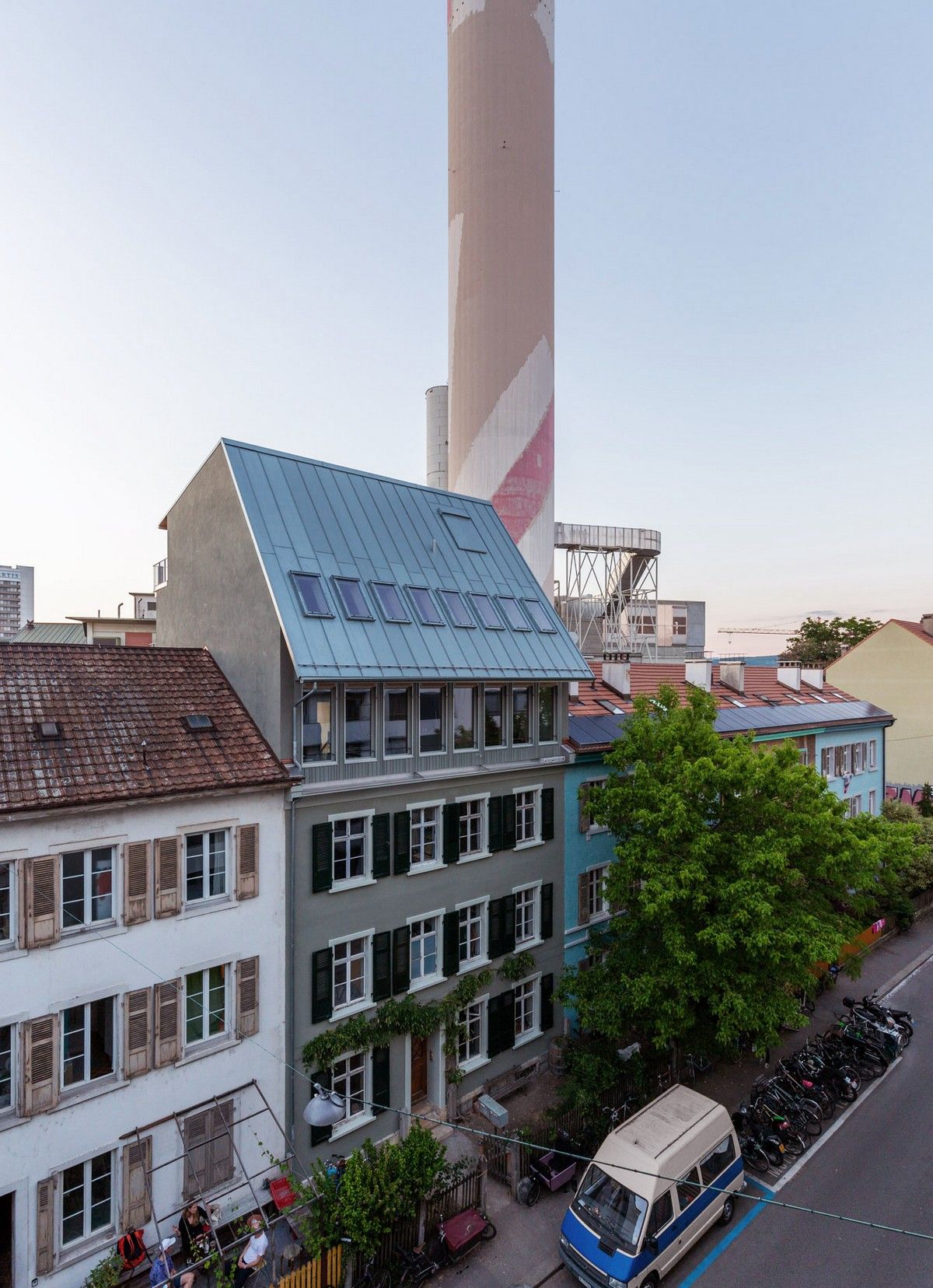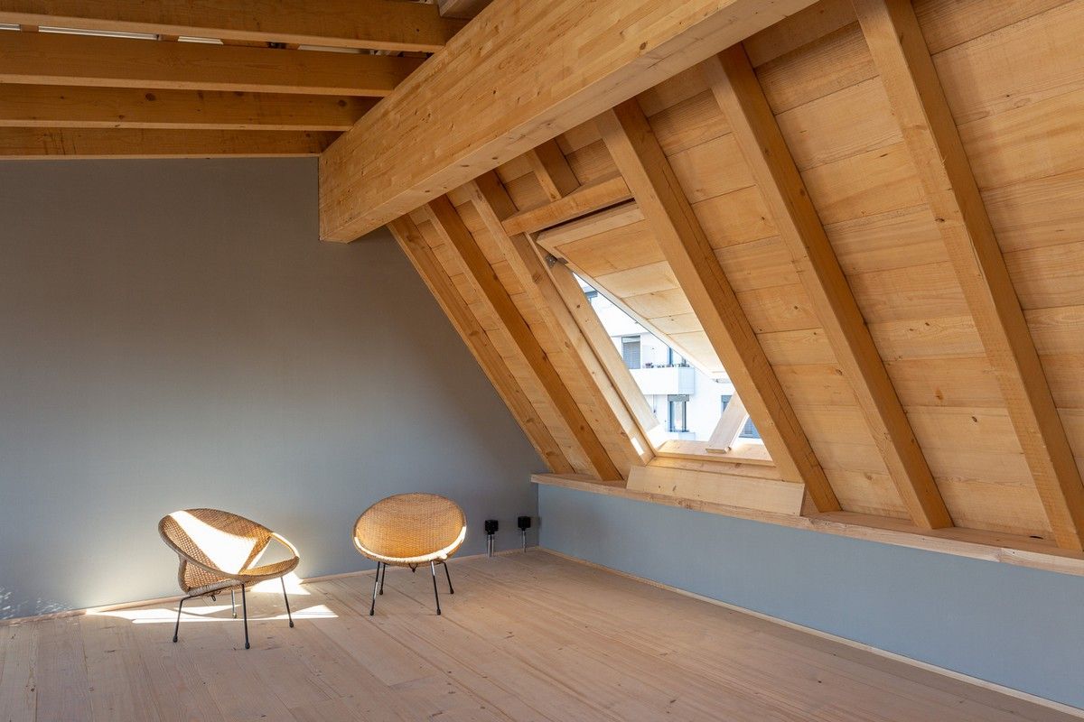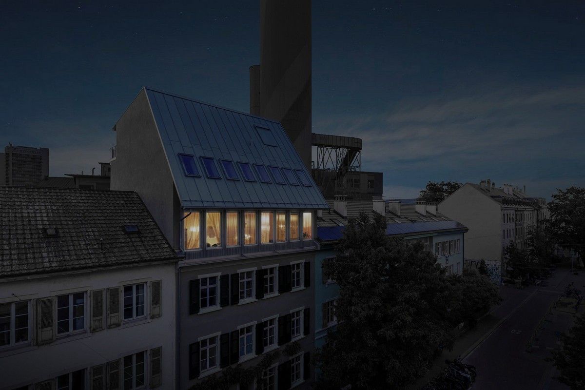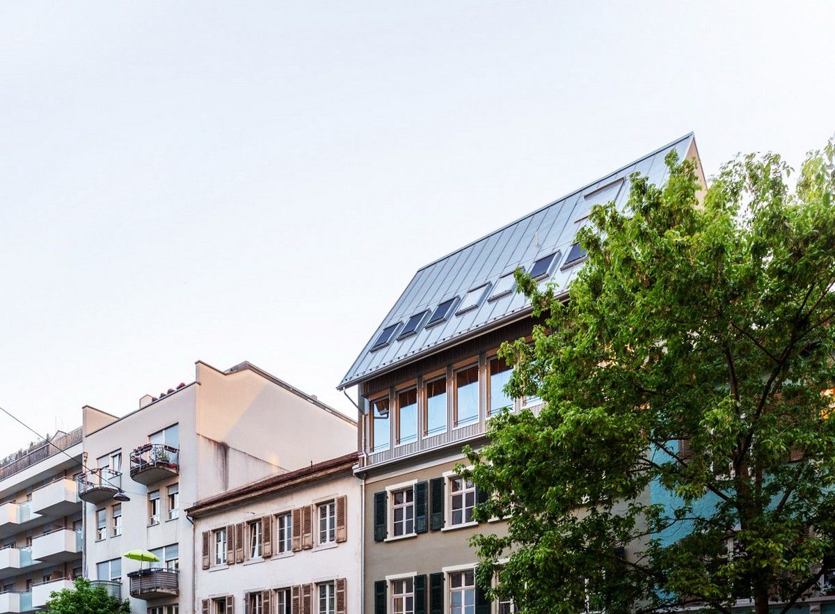 Пристройка новой крыши в трехэтажном доме конца 19 века на Вассерштрассе, 19 в городе Базель, северо-запад Швейцарии, выполнена в 2021 году по проекту архитектурной компании Atelier Atlas Architektur. Многоквартирный дом располагается в старейшем рейнском порту "Санкт-Иоганн" недалеко от моста Драйрозенбрюке. Заказчиком проекта является молодая семья, которая приобрела недвижимость еще в 2014 году.