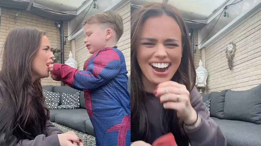 Женщина решила пошутить над маленьким сыном, прицепив к его игрушечному языку прищепку. Когда ребёнок дернул язык, он "оторвался", вызвав сначала испуг, а затем смех.