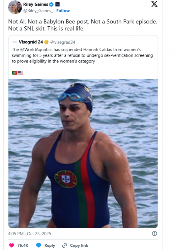 Ситуация вызвала широкий резонанс, вновь подняв вопросы о границах допустимого контроля со стороны спортивных организаций, а также личных правах и защите частной жизни спортсменов на международном уровне.Райли Гейнс - бывший пловец из Университета Кентукки, критиковавший трансгендерных спортсменов, - поделился новостью в социальных сетях, прикрепив к ней фотографию Кальдас.