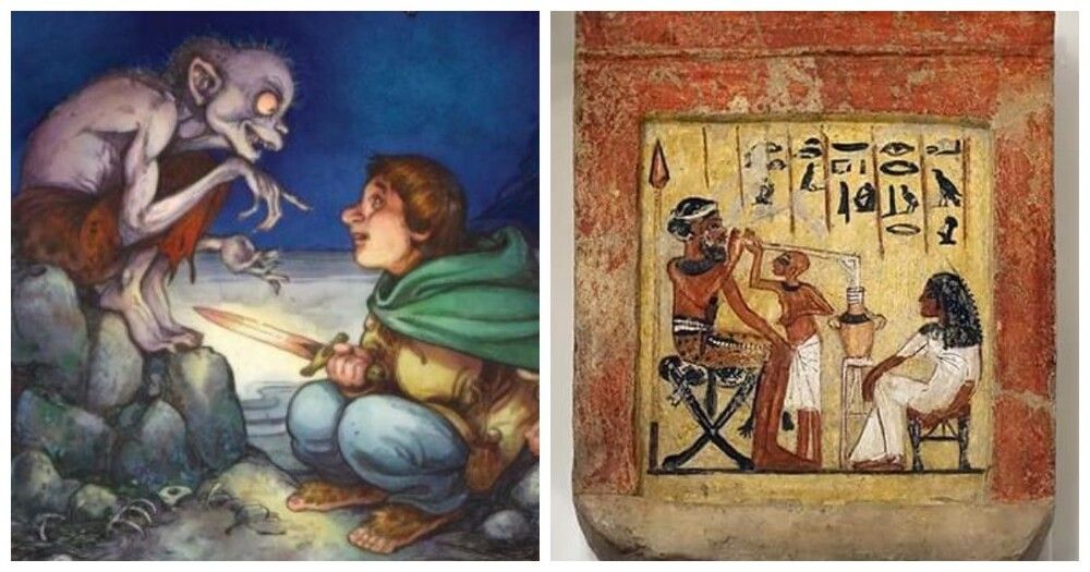 В оригинале "Хоббита" 1937 года Голлум был куда более учтивым созданием. Проиграв загадки, он смиренно указал Бильбо выход, даже после пропажи кольца. Поскольку его природа не была раскрыта, иллюстраторы давали волю фантазии, изображая кого угодно - от призрака до огромного монстра.Позже, работая над "Властелином Колец", Толкин осознал, что благородство Голлума противоречит тёмной силе Кольца Всевластия. Для второго издания 1951 года он переписал сцену, сделав её мрачнее: Голлум попытался напасть на хоббита.Чтобы связать две версии, Толкин придумал гениальное объяснение. Первая, прилизанная история была ложью, которую Бильбо рассказал гномам, чтобы скрыть истинную природу своей находки.