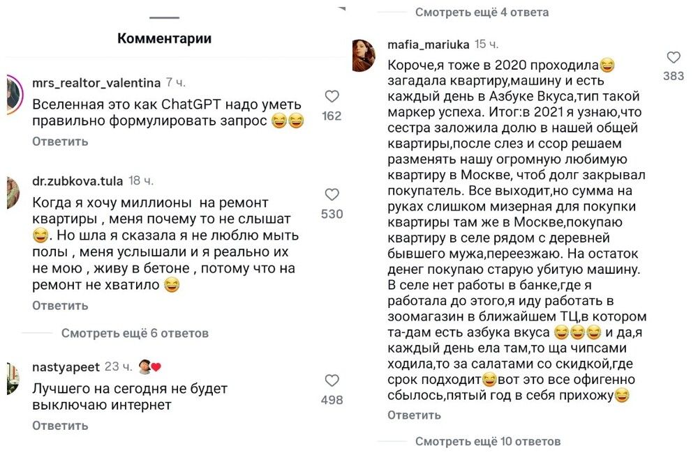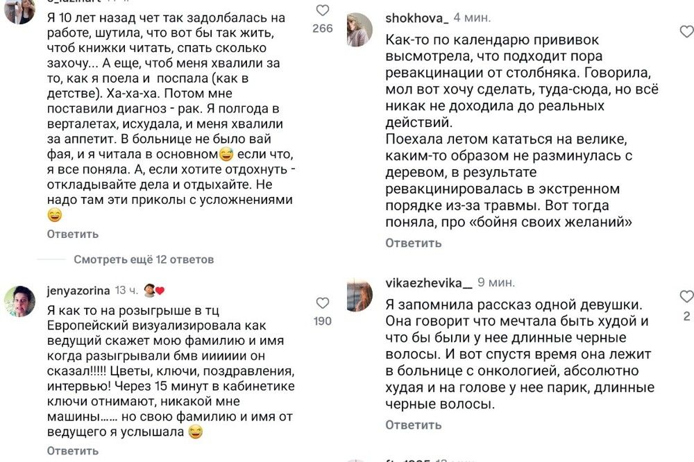 Подробностей этой истории девушка не раскрывала, но попросила интернет-пользователей поделиться своими наблюдениями за исполнением желаний. Выяснилось, что Вселенная действительно может отозваться на просьбу, вот только понимает всё буквально и не всегда так, как хотелось бы мечтателю.