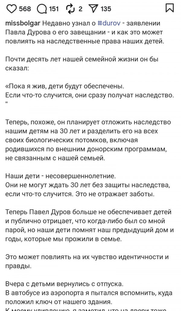 Ирина призналась, что последние годы ей пришлось одной заботиться о детях, поскольку Дуров отрицает их совместное прошлое и отказался обеспечивать наследством. Она рассказала о сложностях жизни без помощи: после досрочного расторжения аренды семейного офиса семьи и переезда в простую квартиру без мебели ей пришлось самой обеспечивать детей и справляться с документальными вопросами."Наши дети несовершеннолетние и не могут ждать 30 лет, чтобы получить наследство", - заявила Болгар, отметив, что Дуров планирует разделить своё имущество между всеми биологическими потомками, включая рожденных с помощью донорских программ. Женщина добавила, что ощущает себя "виноватой" перед детьми из-за общественного отрицания их существования.Между тем, Ирина с тремя детьми живёт в Швейцарии. В июне всей семьей они летали на каникулы в Испанию, о чём Болгар также сообщила в соцсетях.Сейчас она утверждает, что Дуров прекратил платить алименты на детей после того, как Ирина отказалась оставить их на ПМЖ в Арабских Эмиратах. Представитель же Дурова заявил, что Павел много лет выплачивал щедрые алименты (по данным Forbes - €150 тыс. ежемесячно), пока не понял. что женщина тратит деньги на себя, а не на детей. Болгар хвалилась покупкой люксовых вещей, предметов роскоши и даже не пыталась отложить что-то на счета наследникам Дурова.Судя по видео, которые выкладывает Болгар, она с детьми и сейчас вовсе не бедствует.Что касается завещания, то её дети - не единственные наследники создателя Телеграм, и другим женщинам, родившим от Дурова, непонятно, почему именно Болгар-младшие должны иметь какие-либо привилегии. Тем более, что по свидетельству Дурова, у них не было семьи, а присутствовало деловое соглашение.