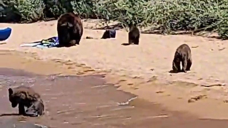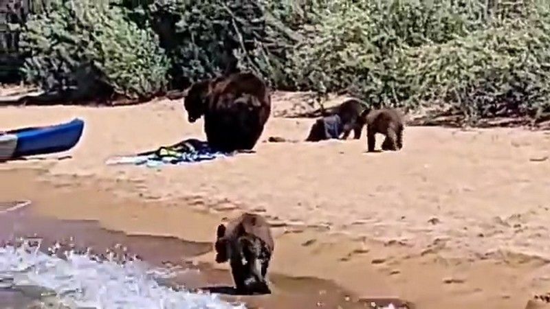 Когда в воскресенье температура поднялась до 33°C, медведи максимально использовали свое окружение, и три медвежонка боролись к воде, прежде чем мать-медведица присоединилась к ним.Пляжник Джен Уоткинс успела заснять медведей, как они резвились в воде, прежде чем позагорать на пляже."Мы все были немного шокированы", - сказал Уоткинс KCRA, добавив, что взрослая медведица опустошила чей-то холодильник, прежде чем покинуть пляж и поспешить обратно в лес.Хотя сцена была столь же трогательной, сколь и удивительной, Офис шерифа округа Плейсер предупредил, что приближаться к медведям "очень опасно".