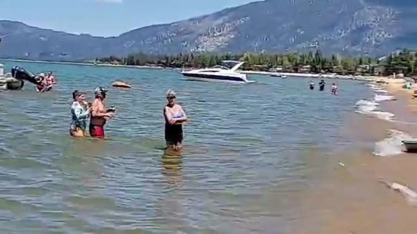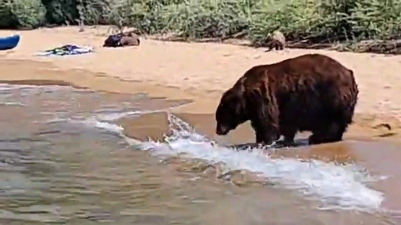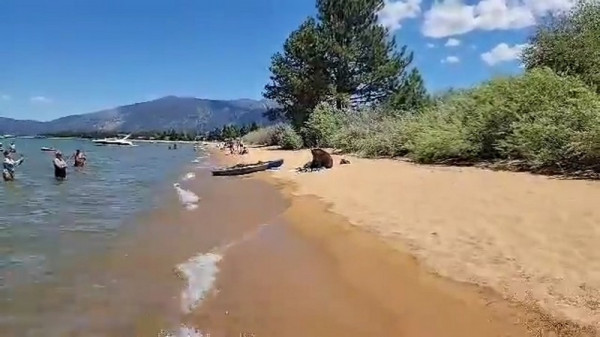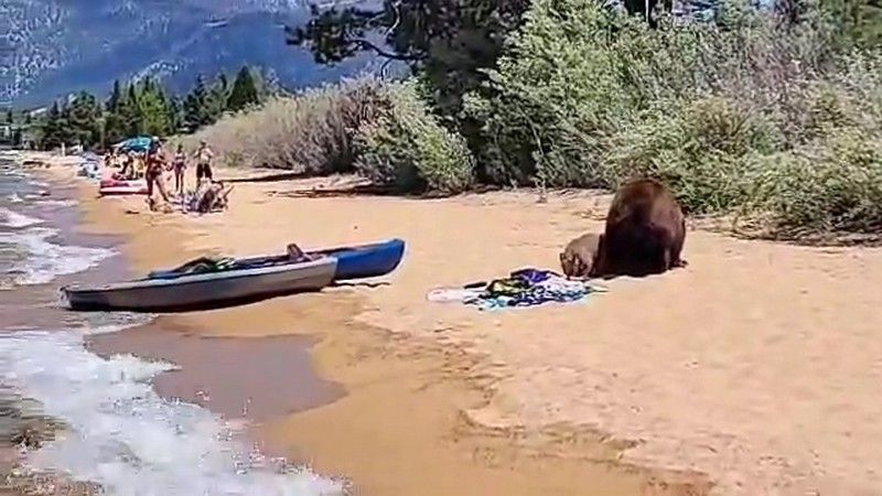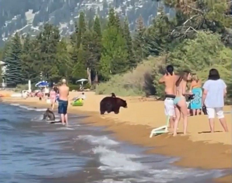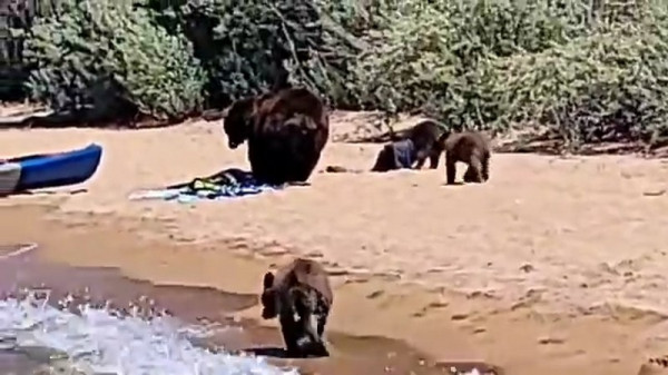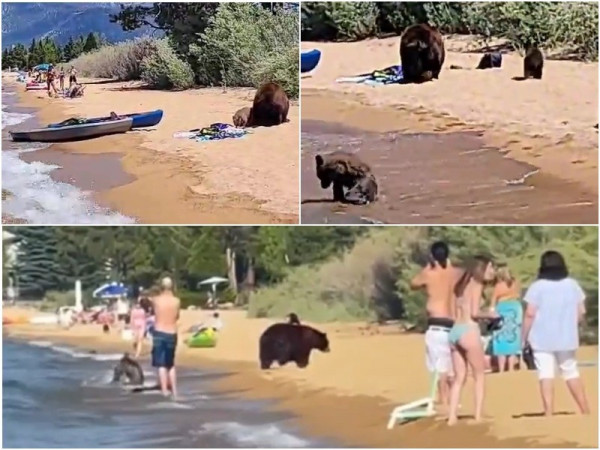 Большая взрослая черная медведица и ее три медвежонка посетили пляж Южного озера Тахо в прошлые выходные, где они спасались от жары, играя в воде, ошеломляя пляжников, которые смотрели на это зрелище и были в шоке.