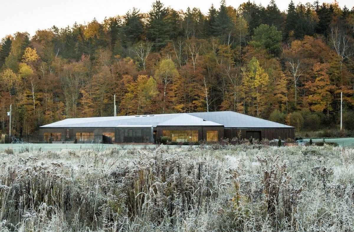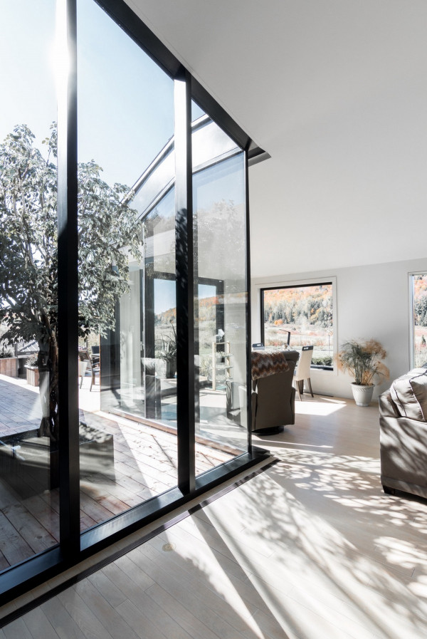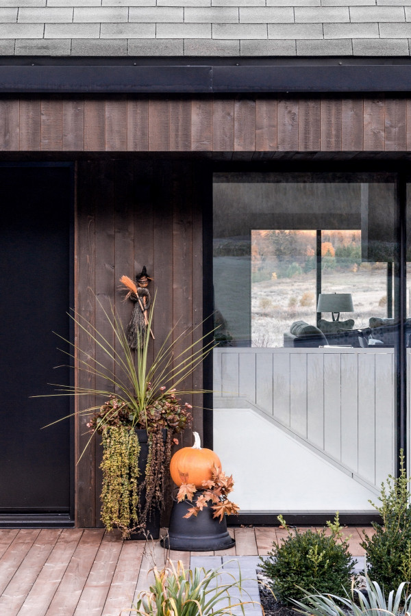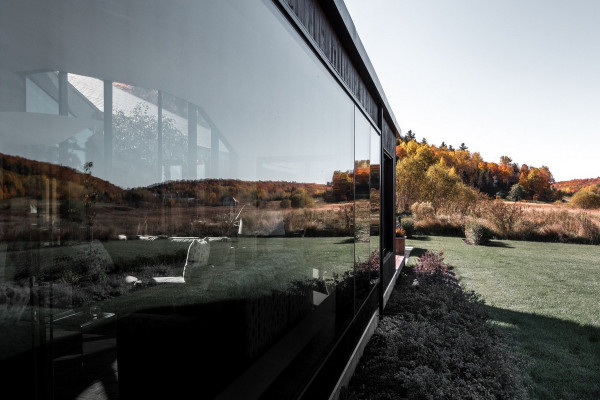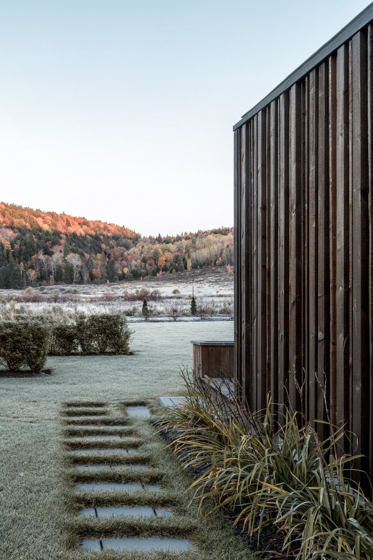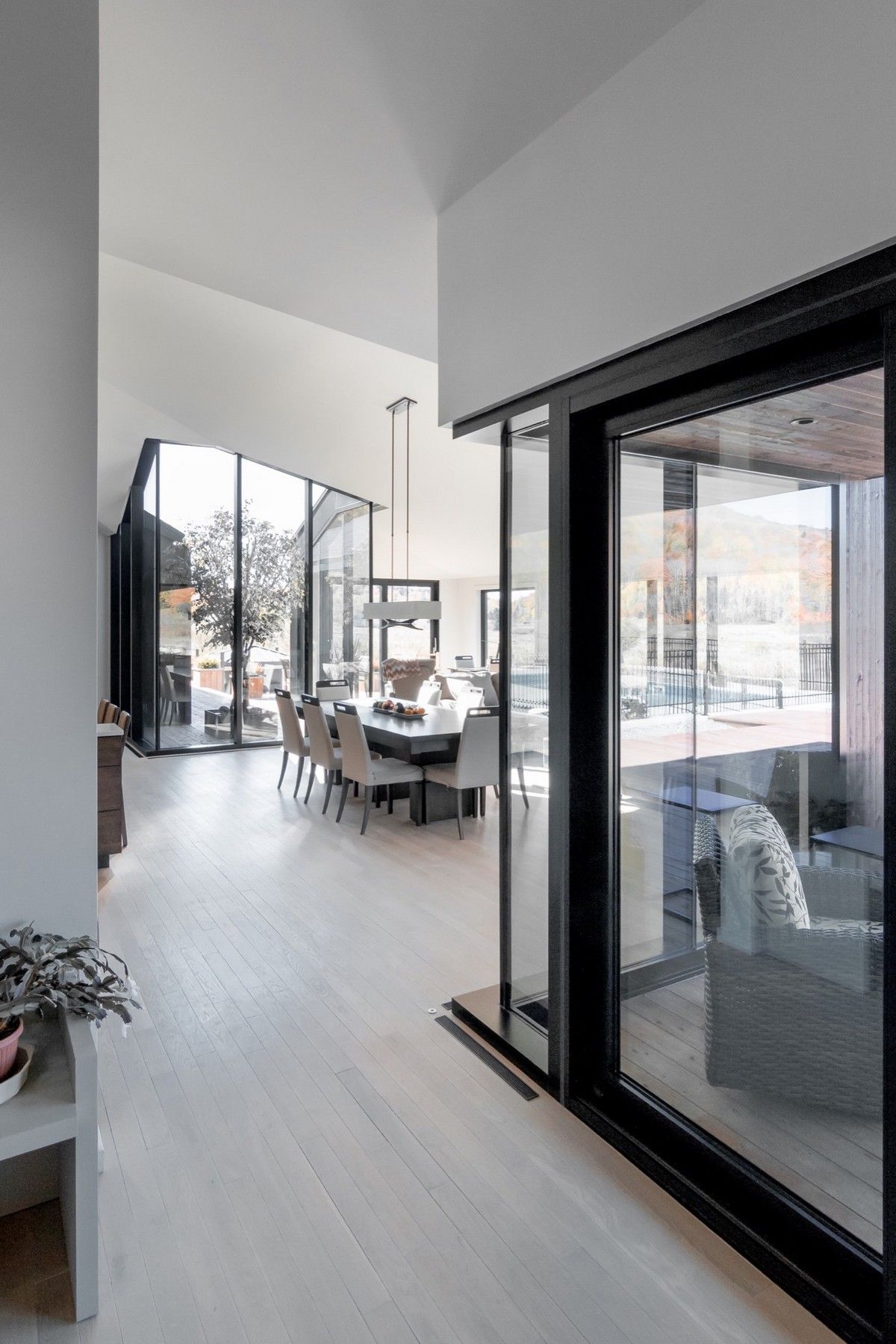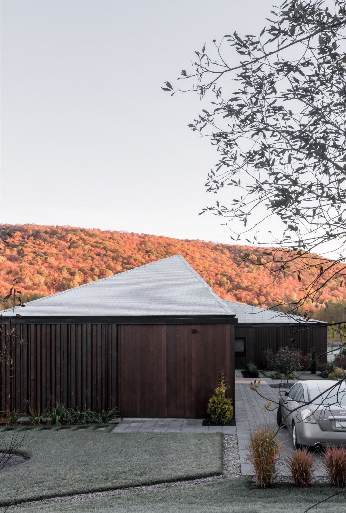 Резиденция расположена на участке, где ранее располагалась съемочная площадка, где были сняты большинство сцен легендарного телесериала 90-х "Эмили. Дочери Калеба". Бескрайние виды, холмистая местность, старые амбары, плетни и дикие цветы: каждая деталь участка бесконечно напоминает об этом историческом повествовании из жизни деревенского Квебека начала XX века.Дом состоит шести спален, двух семейных гостиных, четырех ванных комнат и трех гаражей, расположенных преимущественно на первом этаже.Крыша, с её многочисленными наклонными плоскостями, неправильными углами и линиями, а также полным отсутствием свесов, была задумана как геометрическая интерпретация характерной холмистой местности участка. Вместо слияния с горизонтом, крыша создаёт архитектурный диалог с окружающим ландшафтом. Она бесконечно изменяется в соответствии с перспективой и точкой обзора резиденции.Намерение связать дом и участок авторы проекта достигли благодаря внедрению серии террас, каждая из которых проецирует себя прямо в поле. Главная терраса расположена неподалеку от входа, образуя эффект сжатия. Она вжимает окружающий ландшафт в дом, образуя укромный садик. Идея этого сада продиктована самой архитектурой дома и является производной от работ Райта.Внешние стены из деревянных досок были спроектированы для создания динамичной и уникальной текстуры, определяемой бесконечно меняющимся естественным освещением на протяжении дня и в разные времена года.