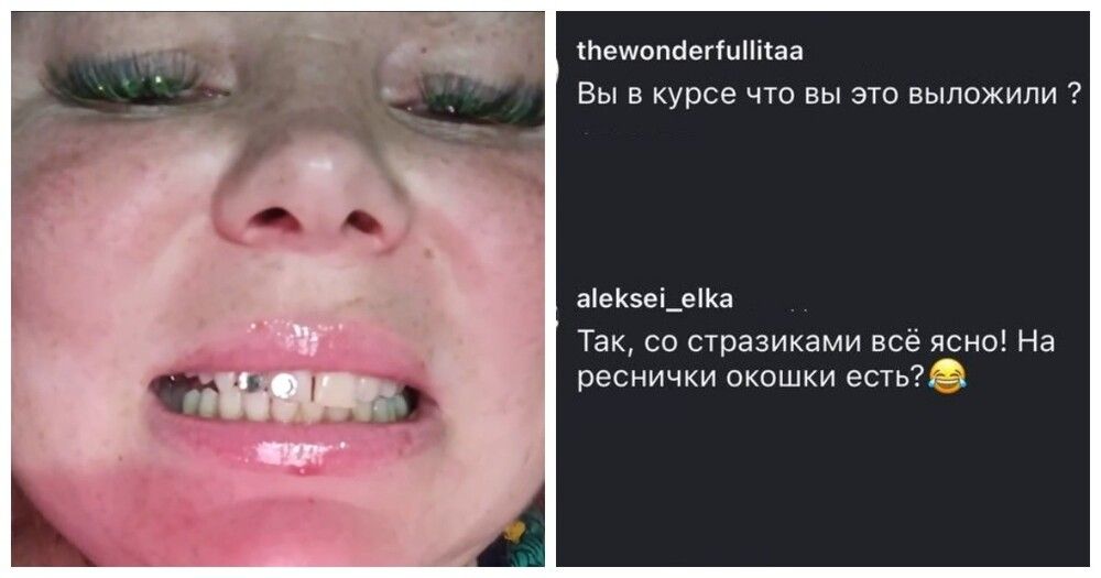 Странная женщина рекламирует необычную процедуру: наклейка стразов на зубы - маленький за 300, большой за 600. Комментарии под видео просто золото.