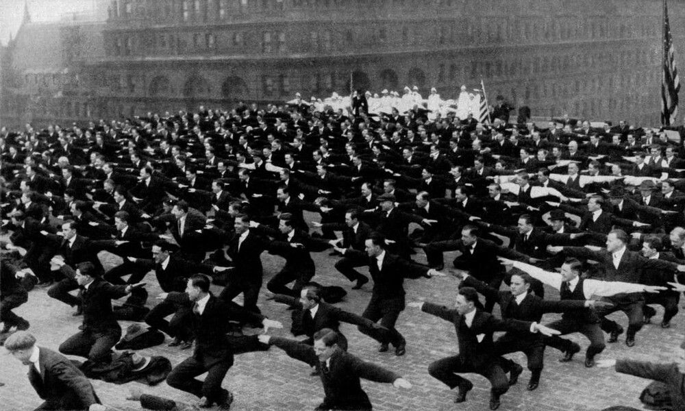Такая подпись стояла под этим фото, опубликованным в 31 номере журнала National Geographic за 1917 год.В действительности американцы в Нью-Йорке просто проводят обеденный перерыв на работе, занимаясь спортом на крыше.