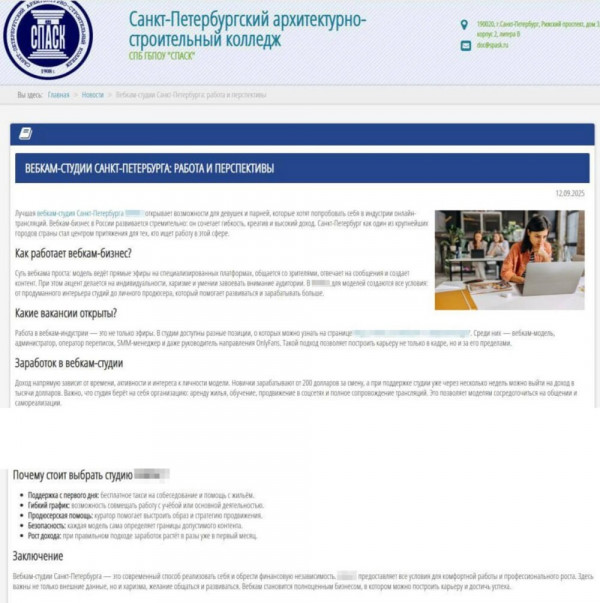 Пользователи сети обнаружили на сайте Санкт-Петербургского архитектурно-строительного колледжа ("СПАСК") в разделе новостей совсем не то, что ожидает увидеть посетитель ресурса учебного заведения. Там было размещено обширное объявление о "лучшей в городе" вебкам-студии, которая "открывает возможности для девушек и парней".Отмечается, что рекламу "современного способа реализовать себя и обрести финансовую независимость" разместили на сайте 12 сентября. В объявлении рассказывается о том, как работает вебкам-бизнес и как на нём заработать. "Суть вебкама проста: модель ведет прямые эфиры на специализированных платформах, общается со зрителями, отвечает на сообщения и создает контент. При этом акцент делается на индивидуальности, харизме и умении завоевать внимание аудитории", - говорится в объявлении.