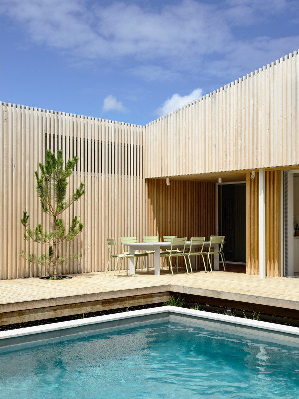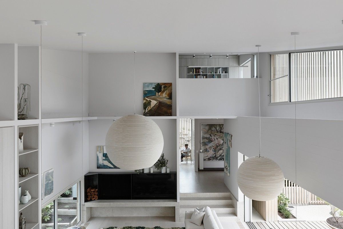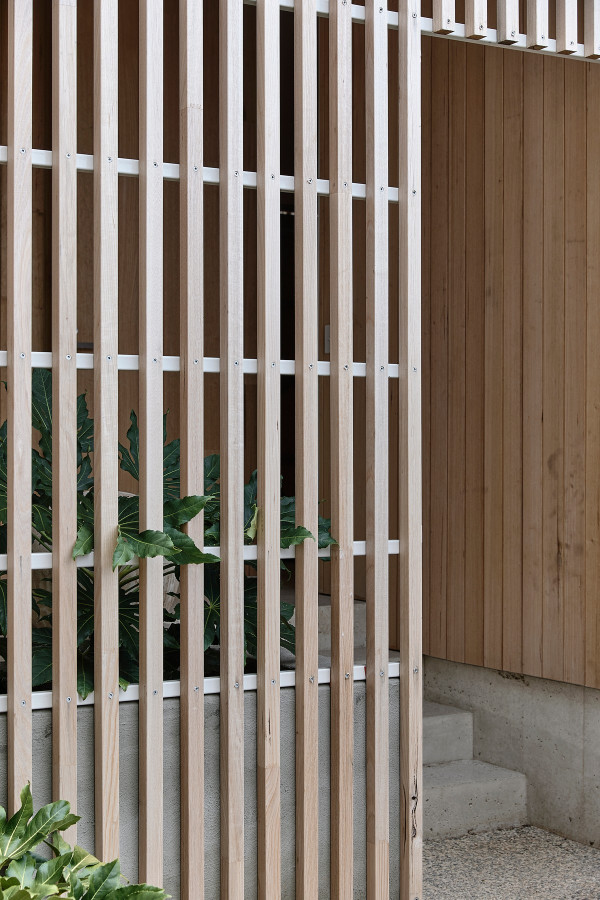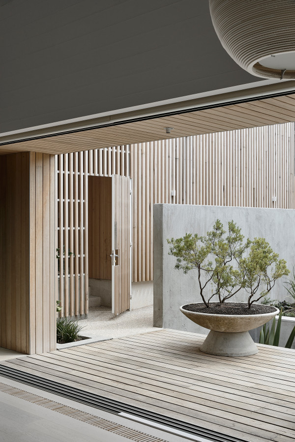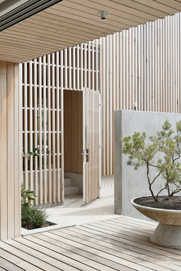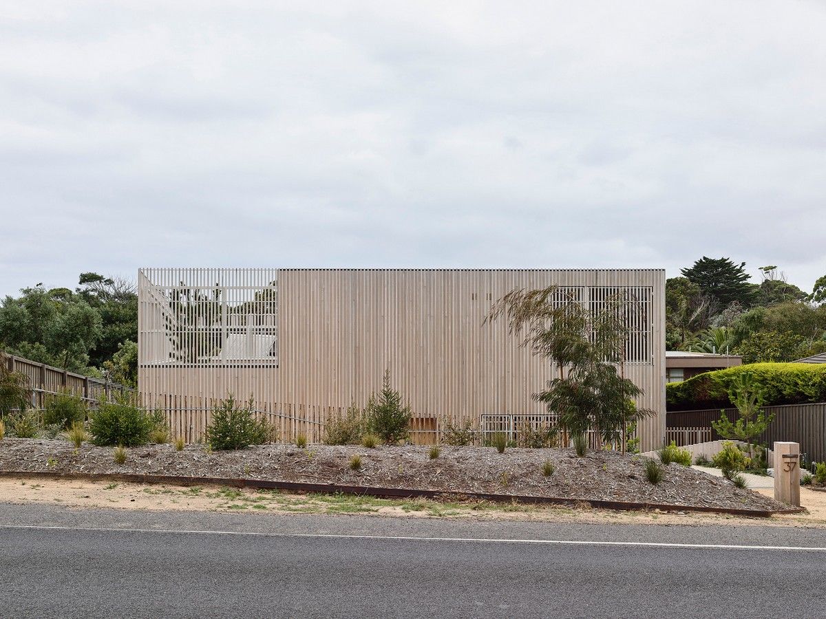 Основанная на эклектичных художественных интересах заказчиков, включая японское, греческое, коренное население и модерн середины века, а также на очарование японского дизайна в целом, эта архитектура является буквальным ответом на чётко сформулированное дизайнерское задание. В брифе просили создать "пушистый белый кокон в японском стиле", который будет приватным, умиротворяющим, свежим и органичным. Спокойное место для жизни, работы, отдыха и развлечений. Что-то, что может работать с меняющимся количеством людей и при этом обеспечивать ощущение спокойствия и уединения, независимо от того, есть ли там только один человек или целая шумная семья. С точки зрения контекста, проект реагирует на характеристики прибрежной обстановки, а не на более пригородные характеристики построенного района.Форма дома проста. Используя поперечно-клееную деревянную структуру (CLT), включая пол, стены и крышу/потолок, сделанные из выращенной в Австралии сосны, обработанной и изготовленной в Виктории, крыша из одного скиллиона (Односкатная крыша в Австралии и Новой Зеландии) покрывает простой прямоугольник с большим вырезом на северной стороне. Крыша наклоняется от задней части и нижнего конца участка на уровне живой изгороди и поднимается под немного более крутым углом к склону участка, позволяя дому осторожно "высунуть голову" над деревом и линией живой изгороди спереди. Фасад был заново засажен местным прибрежным кустарником, который вернет экран растений городского пейзажа с посадками, подходящими для этого района, и еще больше усилит характер пляжа.