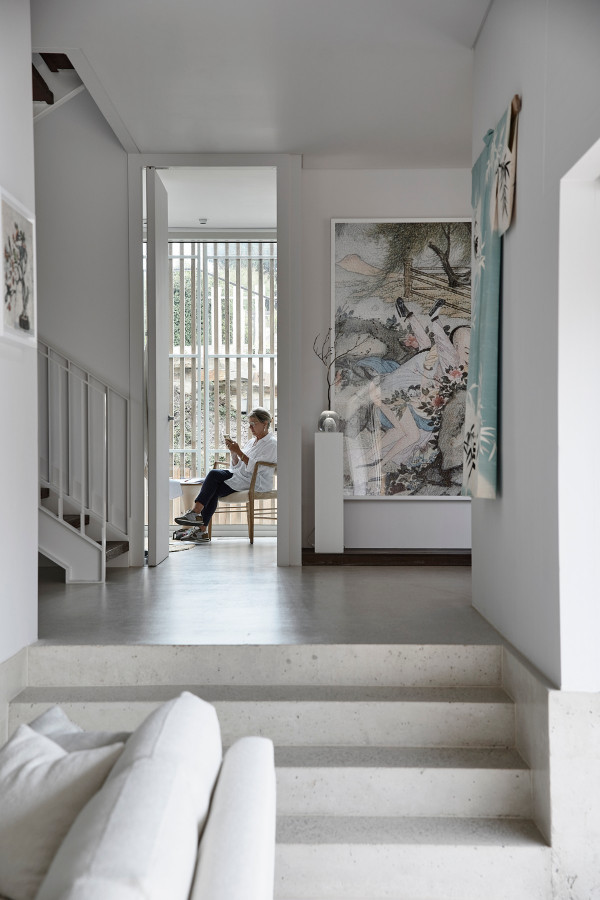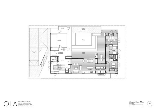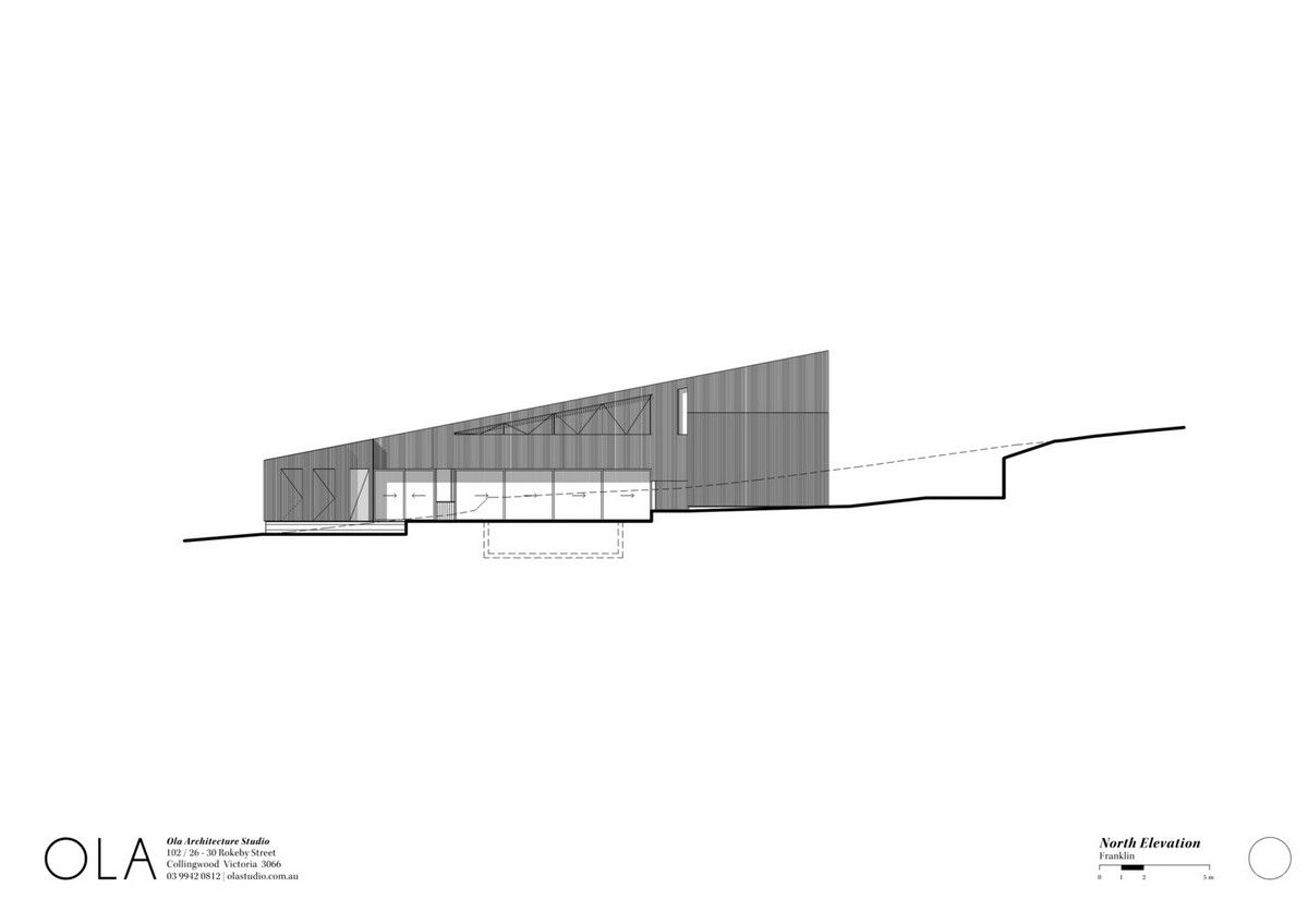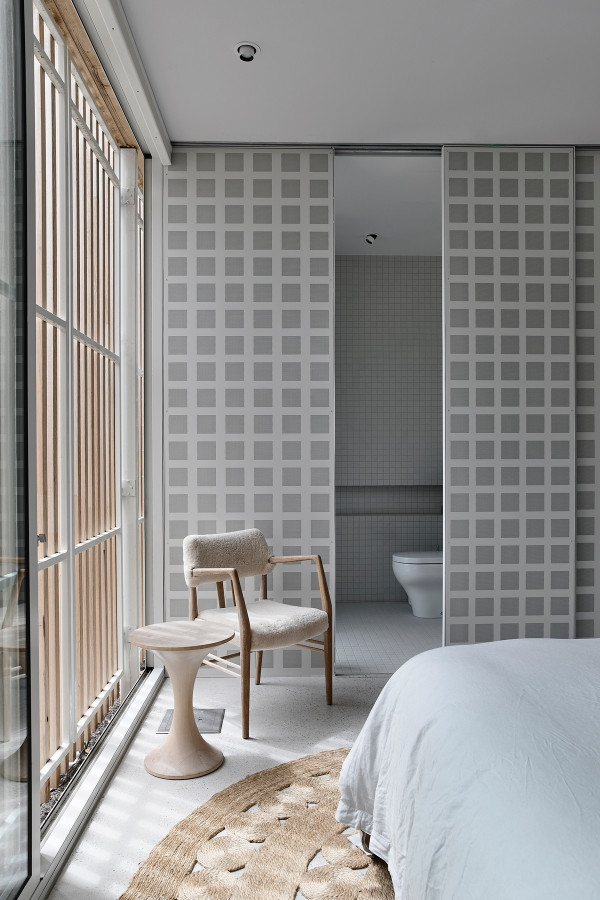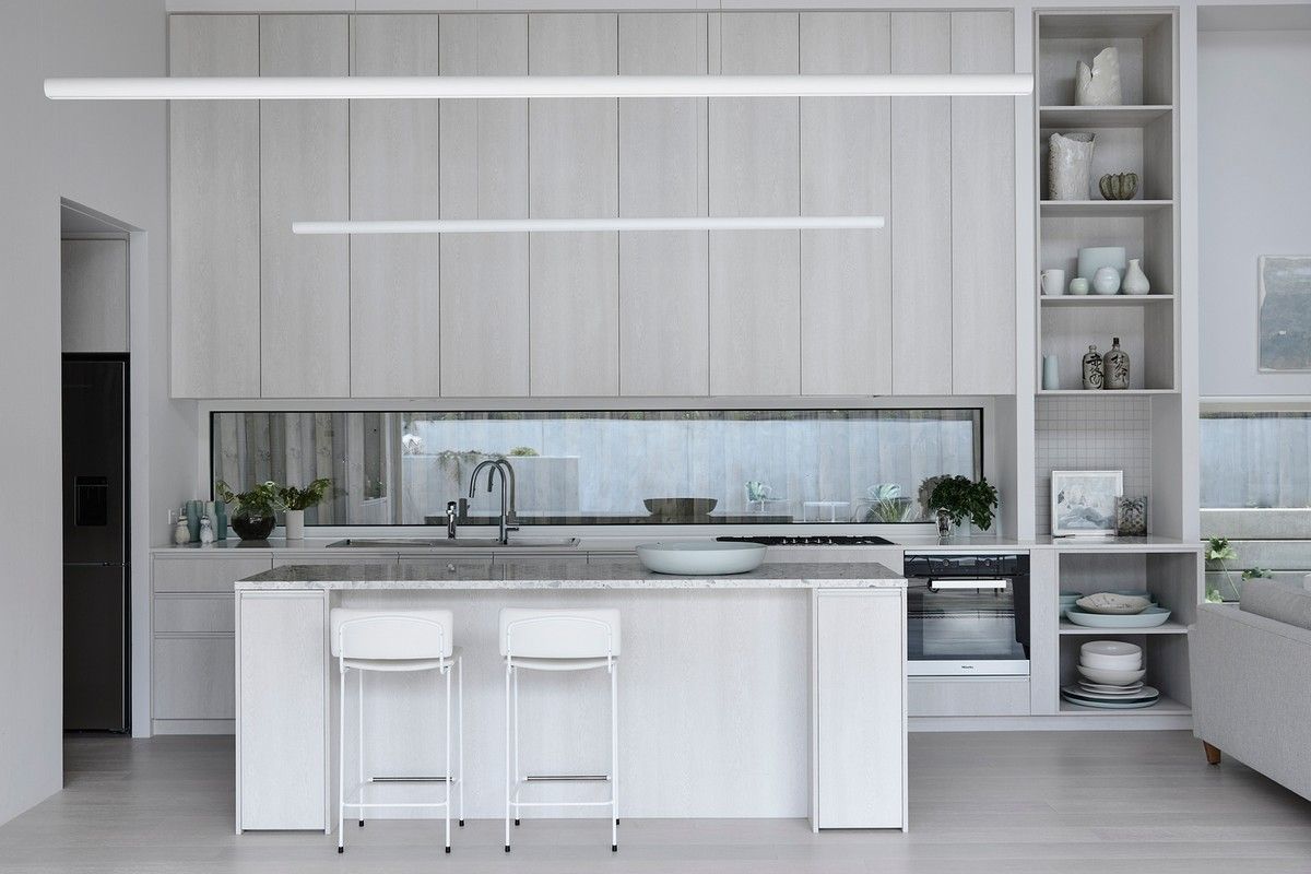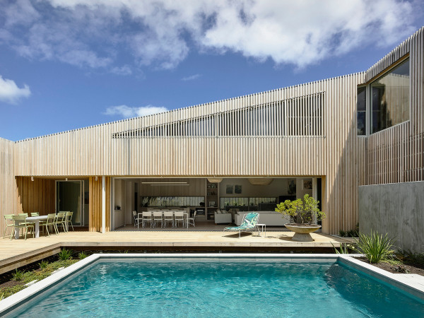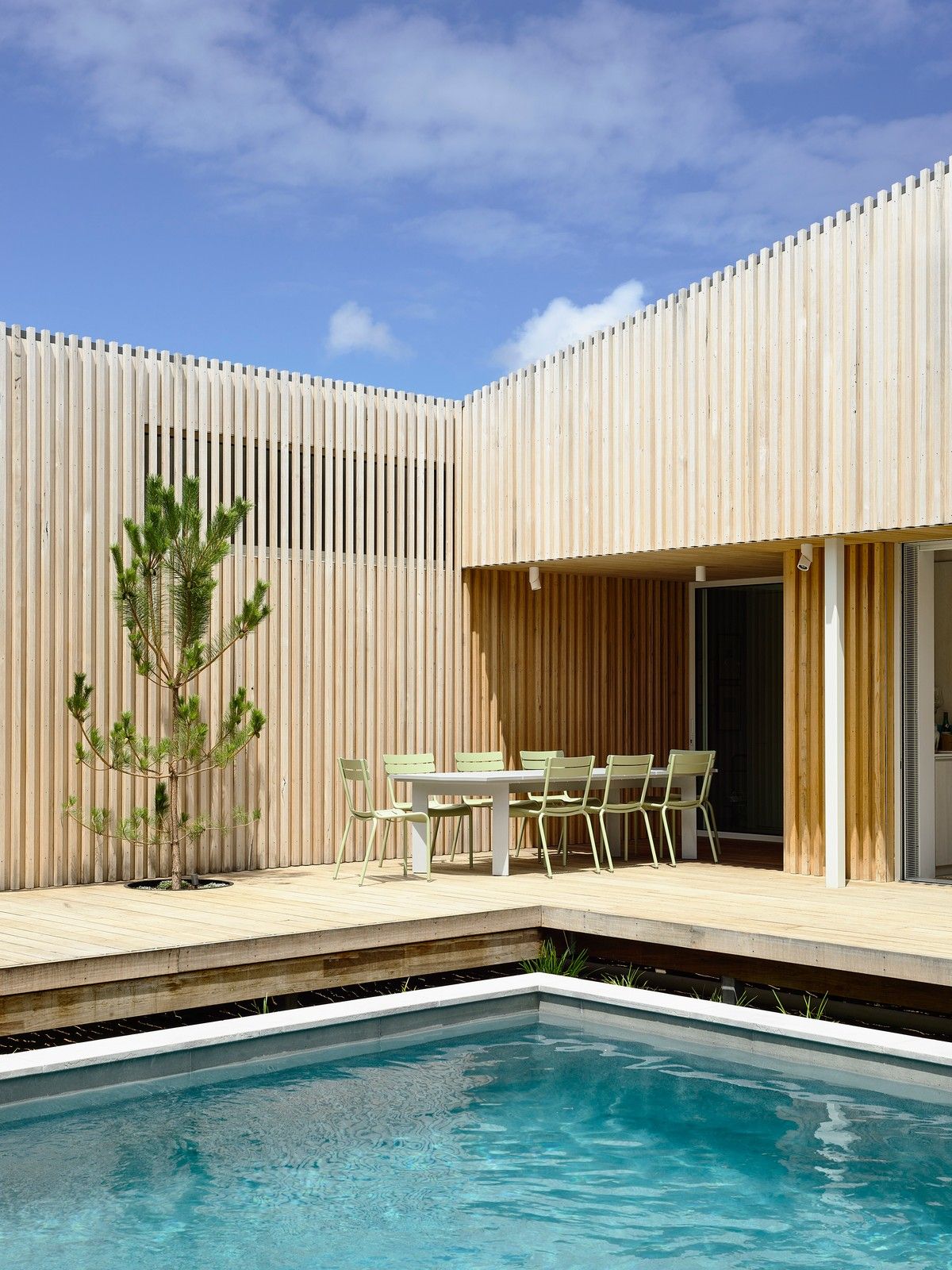 Основанная на эклектичных художественных интересах заказчиков, включая японское, греческое, коренное население и модерн середины века, а также на очарование японского дизайна в целом, эта архитектура является буквальным ответом на чётко сформулированное дизайнерское задание. В брифе просили создать "пушистый белый кокон в японском стиле", который будет приватным, умиротворяющим, свежим и органичным. Спокойное место для жизни, работы, отдыха и развлечений. Что-то, что может работать с меняющимся количеством людей и при этом обеспечивать ощущение спокойствия и уединения, независимо от того, есть ли там только один человек или целая шумная семья. С точки зрения контекста, проект реагирует на характеристики прибрежной обстановки, а не на более пригородные характеристики построенного района.Форма дома проста. Используя поперечно-клееную деревянную структуру (CLT), включая пол, стены и крышу/потолок, сделанные из выращенной в Австралии сосны, обработанной и изготовленной в Виктории, крыша из одного скиллиона (Односкатная крыша в Австралии и Новой Зеландии) покрывает простой прямоугольник с большим вырезом на северной стороне. Крыша наклоняется от задней части и нижнего конца участка на уровне живой изгороди и поднимается под немного более крутым углом к склону участка, позволяя дому осторожно "высунуть голову" над деревом и линией живой изгороди спереди. Фасад был заново засажен местным прибрежным кустарником, который вернет экран растений городского пейзажа с посадками, подходящими для этого района, и еще больше усилит характер пляжа.