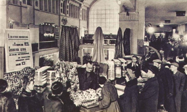 Снижение ценВ декабре 1947 года одновременно с денежной реформой и ликвидацией карточной системы произошло первое снижение цен. Государство отменило коммерческие и пайковые цены на все товары, ввело государственные. Хлеб и мука стали дешевле на 12%, крупы и пиво на 10%. Цены на мясо, рыбу, водку не изменились. А на яйца, молоко, чай даже выросли, так как государство сочло, что пайковые цены на них были крайне низкие. Одежда, обувь, ткани в среднем подешевели в 3.5 раза относительно прежних коммерческих цен. В результате такого шага государство лишилось прибыли 57 млрд руб. Потери кооперативной и колхозной торговли составили 29 млрд рублей. И это было только начало.