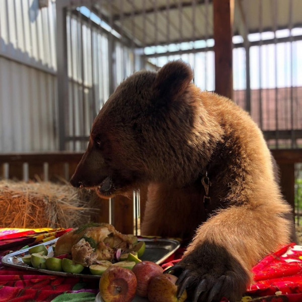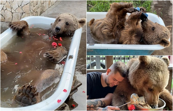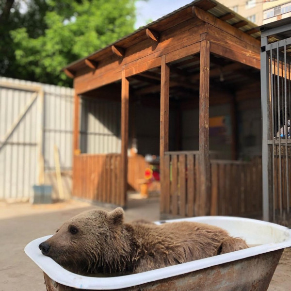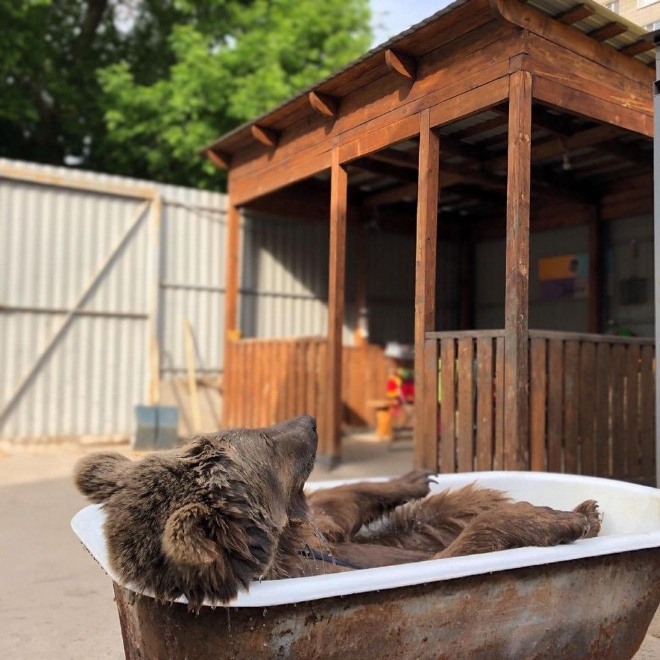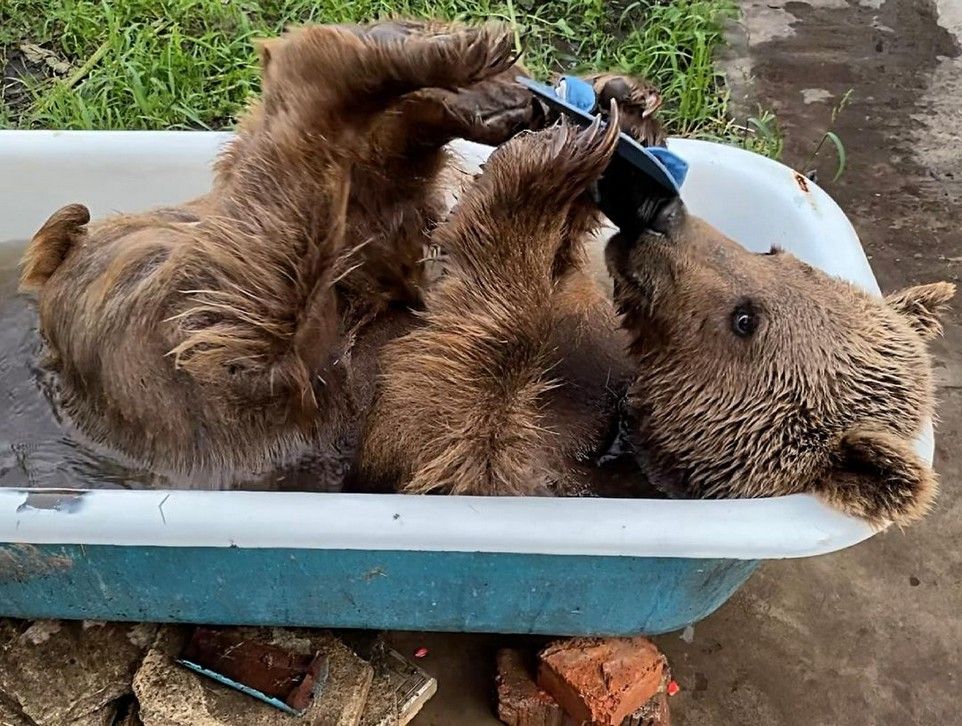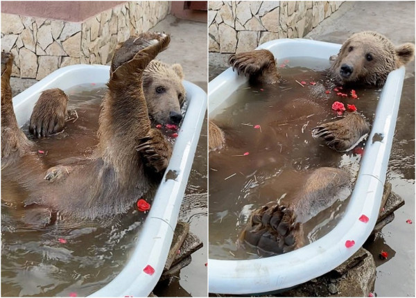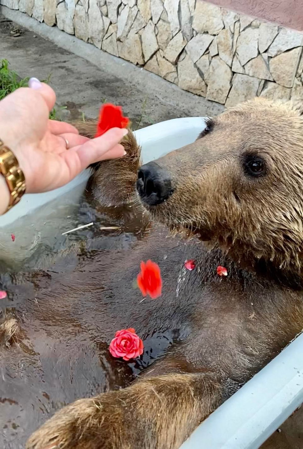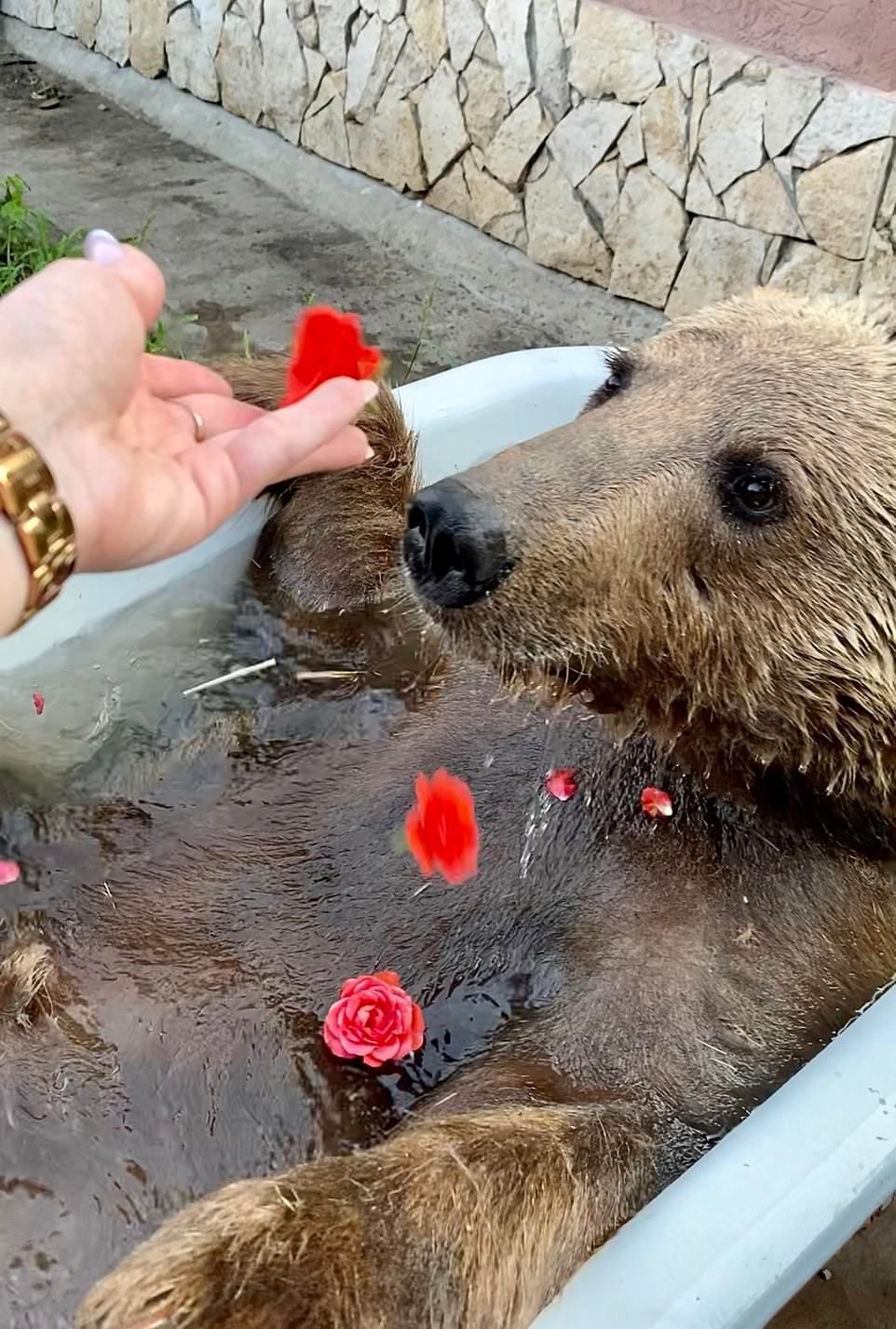 Бурый медведь был снят на видео, принимая расслабляющую ванну точно так же, как и его человеческие друзья. Медведь Балу плескался в воде, усыпанной лепестками роз, в своем вольере в Саратове. По словам его владельца Руслана Цывилева, он любит валяться и нежиться в воде на спине, как это делают люди после долгого рабочего дня.