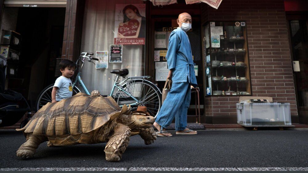 Мужчина уже почти три десятка лет дружит с черепахой по имени Бон-чан. Вместе они гуляют по городу и вызывают улыбки у всех, кто попадается им на пути.
