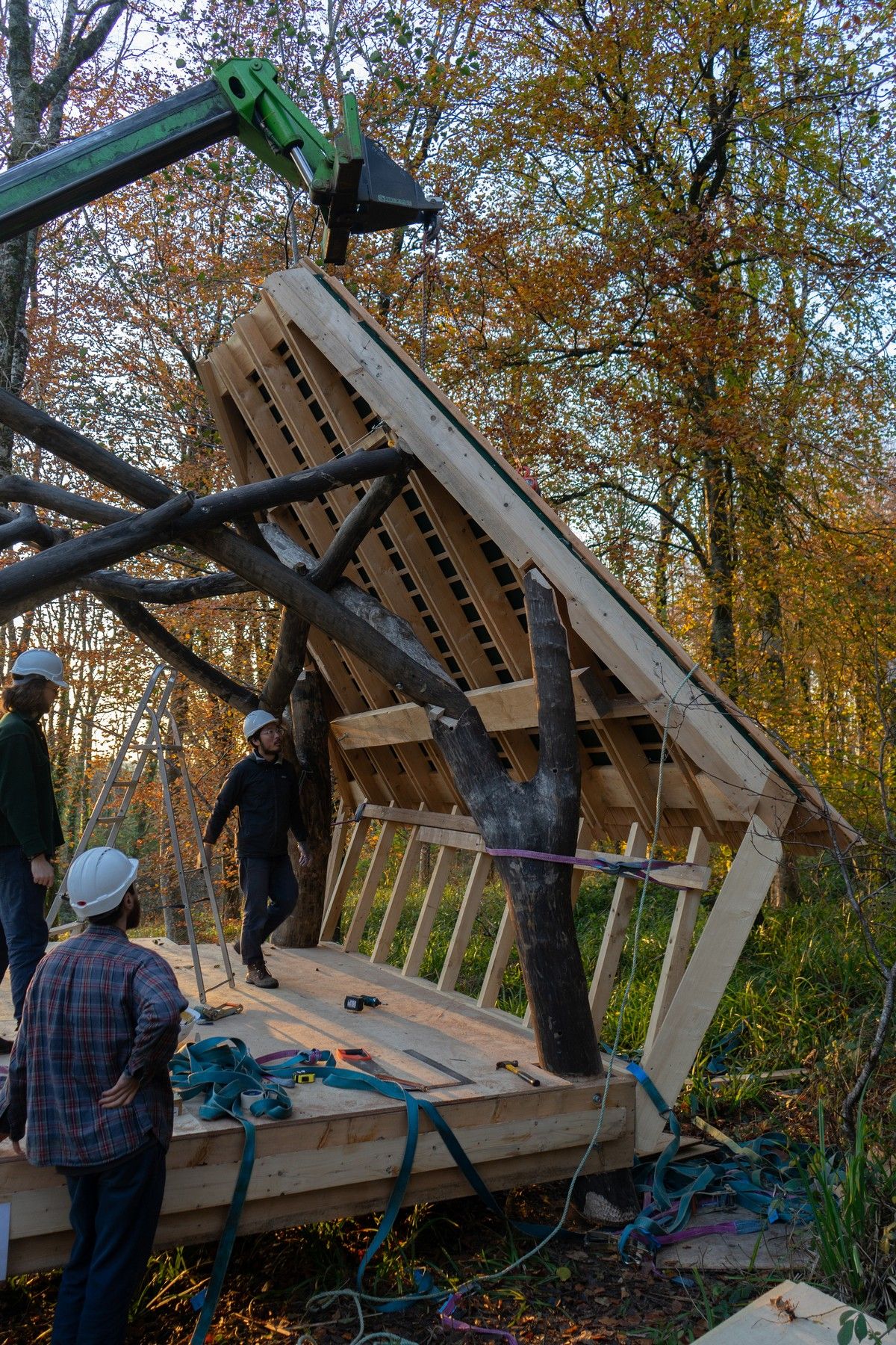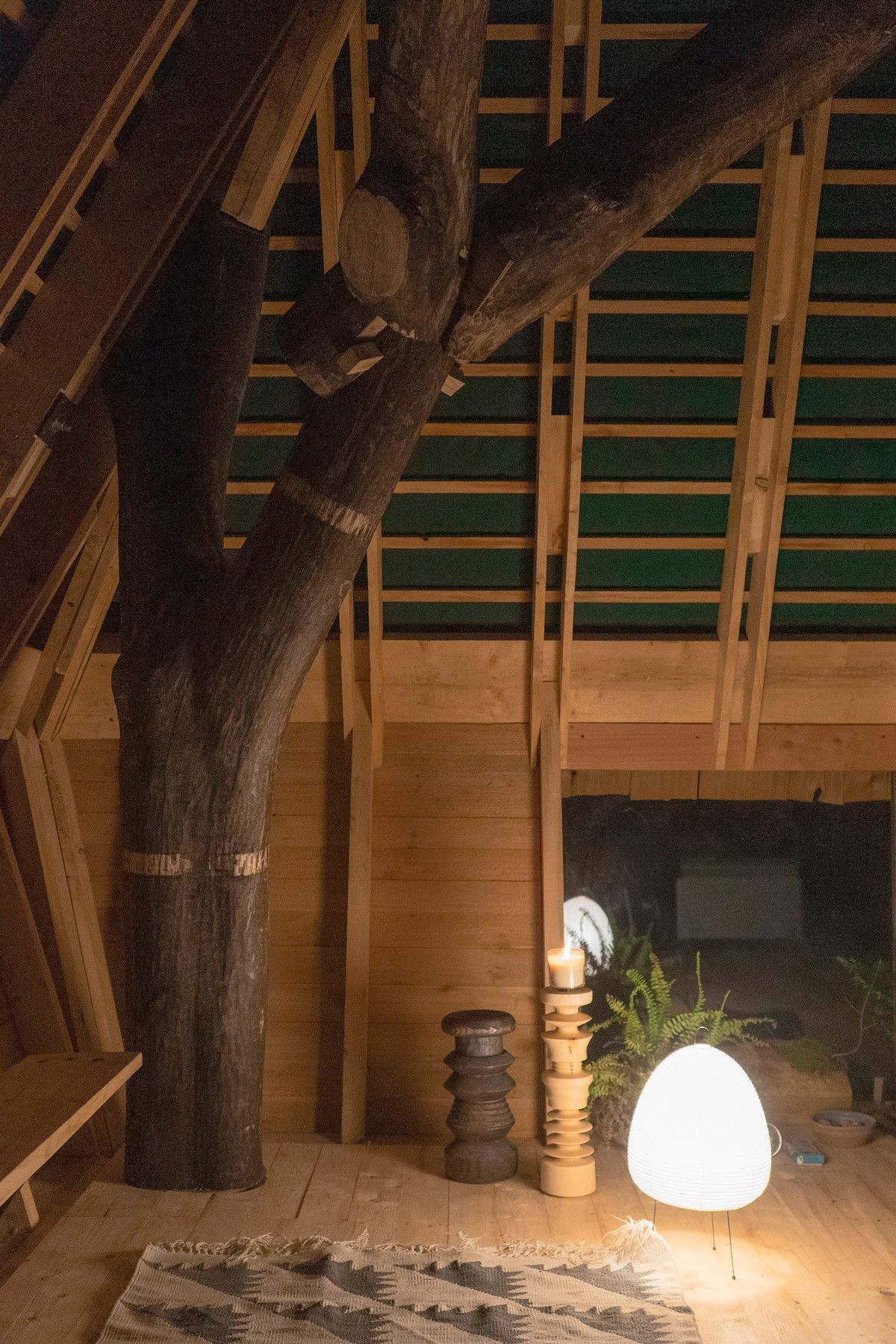 Первичная конструкция опирается на четыре бетонных фундамента. Конструкция состоит из ветвей деревьев разного размера, расположенных в виде четырех колонн, соединенных элементом распорки. Для учета геометрии дерева как основного звена конструкции были использованы роботизированные технологии. Пять окон являются не только источником света, но обеспечивают многослойное расположение в пространстве, позволяющие расширить вид на внешний ландшафт.Сдержанный экстерьер скрывает тщательно продуманный интерьер. Открывая складную дверь попадаешь в помещение, залитое естественным светом сверху. Сетка, подвешенная над головой, и мансардное окно привлекают посетителя найти способы получить к ним доступ. Далее большое панорамное окно переносит взгляд на лесной массив. Ряд стволов деревьев выступает из пола и разветвляется внутрь, образуя крону ветвей, которые цепляются за крышу. Элементы мебели обеспечивают ступеньку в ветвях, позволяя подняться в пространства, которые могут быть как уединенными, так и социальными.Архитектура данного проекта уникальна, в нем были использованы современные методы плотницких работ для создания ряда соединений между деревом, а также строение по необходимости можно перемещать.