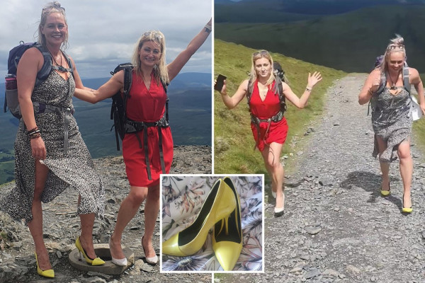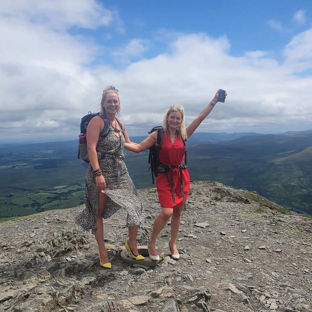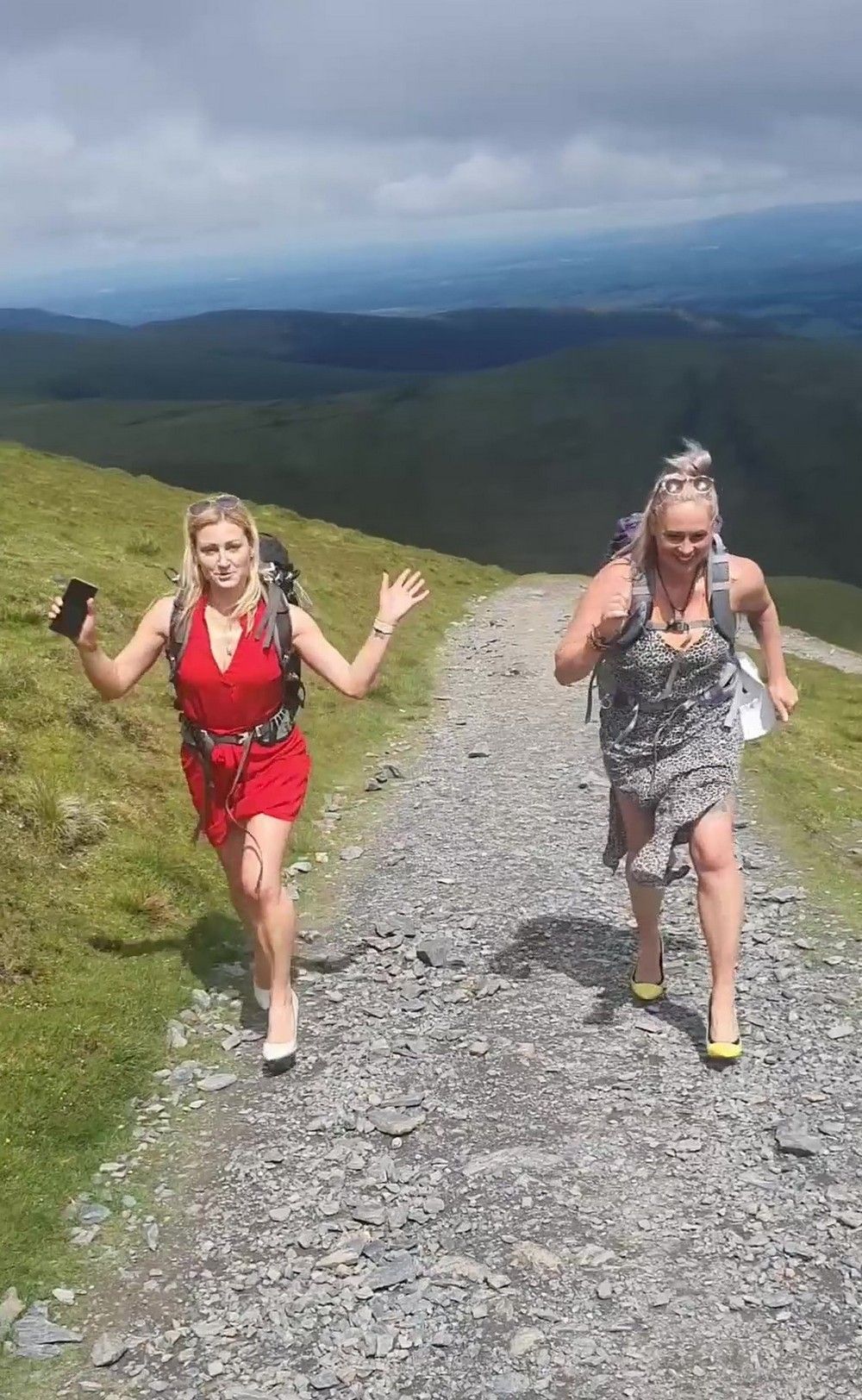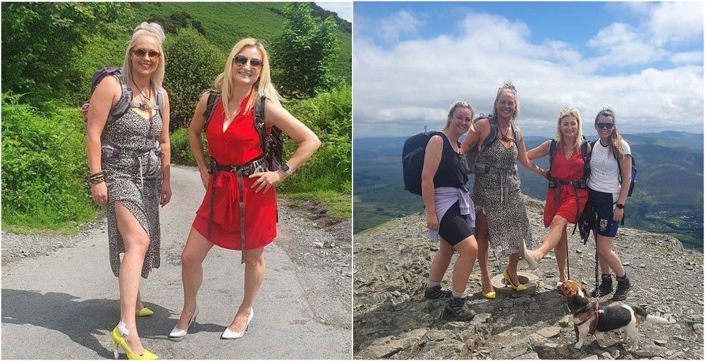 35-летняя Эмма и 42-летняя Коринн поднялись на гору в воскресенье - перед тем, как пробежать последний отрезок пути до вершины Холлсфелл, самой высокой точки пика Уэйнрайт.Эмма из Спеннимура, Дарем, призналась: "Я действительно думала, что все будет очень плохо. Я выбрала туфли на каблуках "Ривер-Айленд", которые ношу уже несколько лет.- Это заняло у нас всего 90 минут, но с пятиминутным отдыхом.- Мы были на седьмом небе от счастья, и никто не пострадал."Товарищи по путешествию предупредили эту пару об опасности неподходящей обуви.Но у опытного дуэта была с собой команда поддержки - и они спустились в прогулочных ботинках.Эмма - соучредительница приключенческой группы Wild Wanderers - и Коринн - собрали более 500 фунтов стерлингов для помощи женщинам.