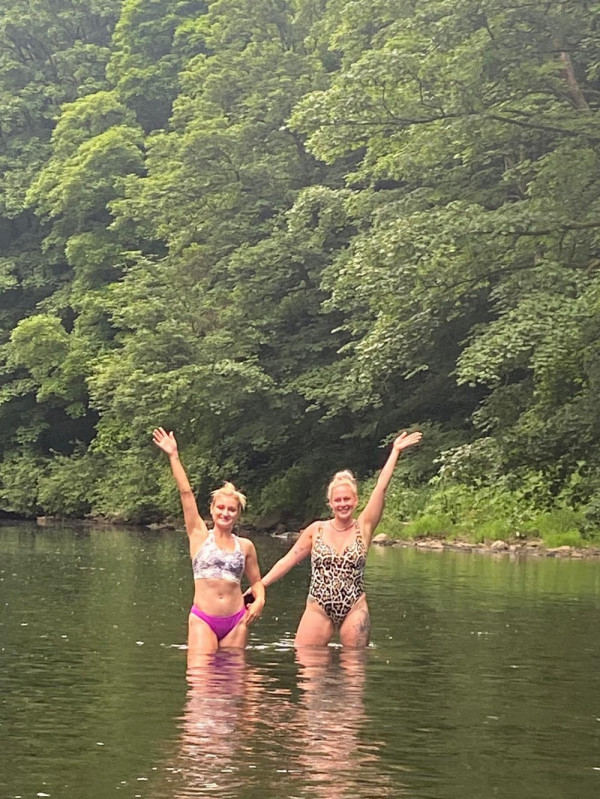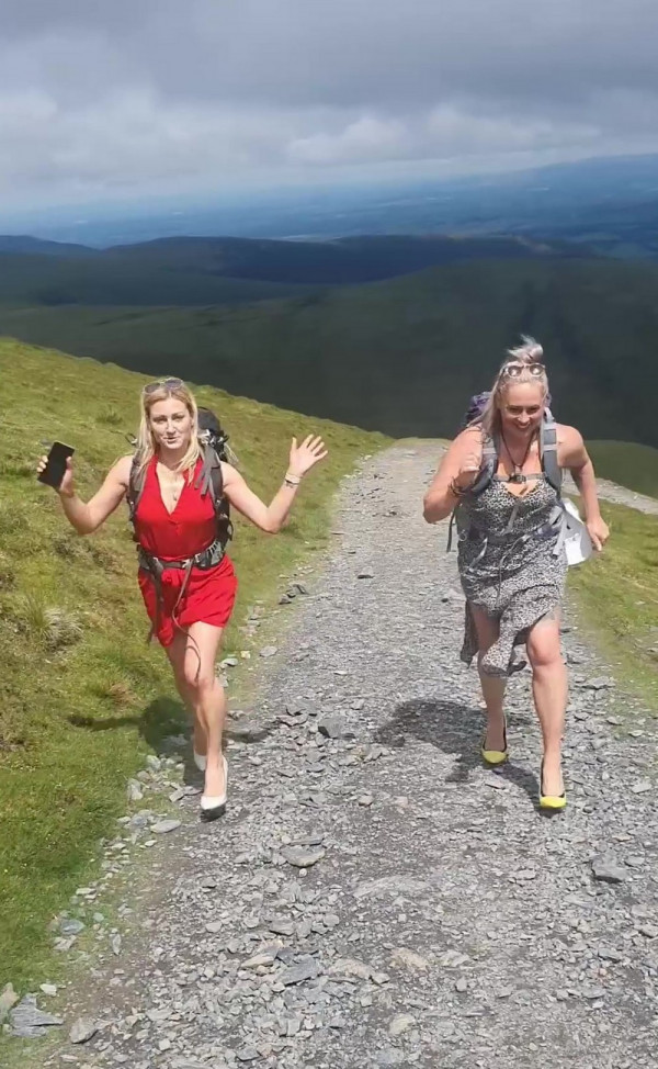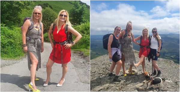 Две гламурные подруги взобрались на внушительную гору Озерного края в туфлях на высоких каблуках. Эмма Вудхолл и Корин Мюррей сбросили свою обычную походную одежду для благотворительного восхождения. Они носили 4-дюймовые (10,5 см) каблуки и стильные платья, чтобы преодолеть 2850-футовую (868,7 м) Бленкатру, недалеко от Кесвика, Камбрия.