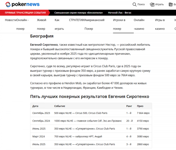 Митрополит Нестор временно лишён руководства Корсунской, Испанско-Португальской епархиями и приходами Московского патриархата в Италии. Теперь его обязанности будет исполнять митрополит Рязанский и Михайловский Марк. Причины этого решения в РПЦ не разглашают, однако СМИ уверены, что отстранение случилось из-за пагубной привычки Нестора. Он заядлый игрок в покер, и неоднократно участвовал в европейских турнирах с неплохим призовым фондом. Удача не всегда была на его стороне, однако в 2024 году Евгений Сиротенко (мирское имя митрополита) стал 20-м на чемпионате Франции по покеру и выиграл неплохую сумму.