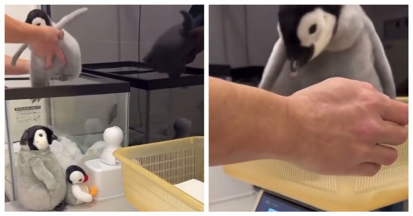Работник японского океанариума продемонстрировал процесс взвешивание детёныша королевского пингвина.