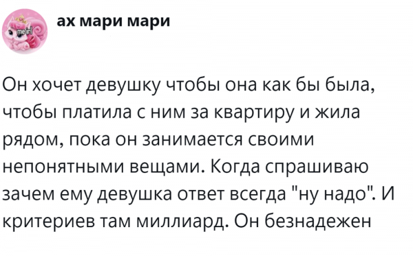 Наверняка в вашем окружении тоже есть такой парень или мужчина. Да и к девушкам и дамам это тоже можно применить. И изъянов типа вредных привычек у него/неё не имеется. А потенциальные женихи или невесты обходят стороной. Пользователи задались целью выяснить, что не так с хорошими людьми, и почему они не могут найти пару и создать семью. Список причин оказался интересным и включил как предсказуемые, так и не неожиданные.