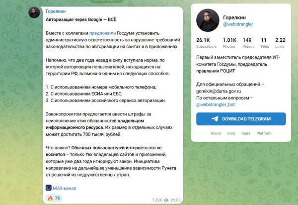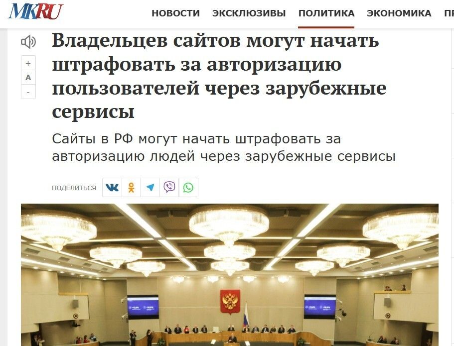 В Государственную Думу 14 ноября 2025 года внесён законопроект, который вводит административные штрафы для владельцев сайтов и интернет-сервисов за использование иностранных методов авторизации.