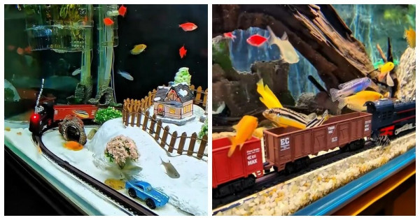 Теперь маленький поезд нарезает круги, останавливается на "станциях", а рыбки гоняются за ним, иногда забираясь прямо в вагончики и "тусят" внутри них.