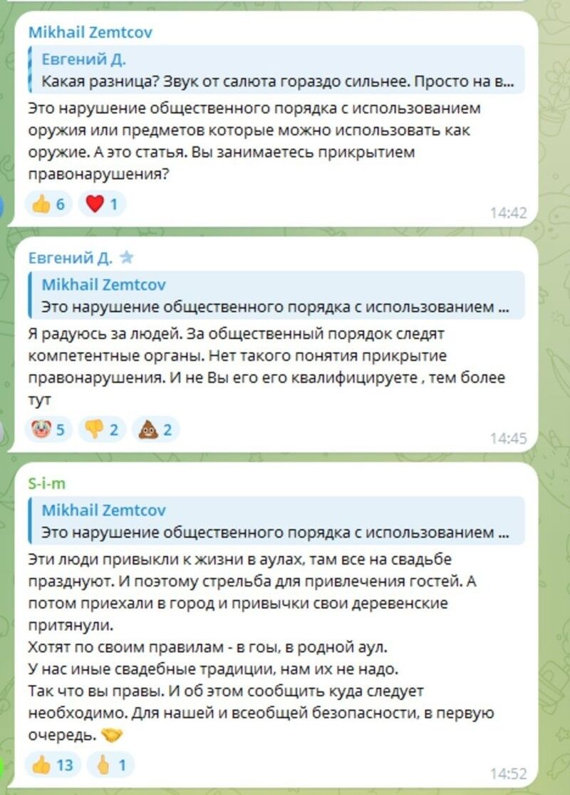 Жители Чехова наблюдали свадьбу, которая была излишне громкой. Музыка гремела так, что была слышна из соседних дворов, молодожены садились в авто под канонаду выстрелов. А затем раздался грохот как будто от взрыва. Учитывая непростое время, многие жильцы соседних домов были изрядно напуганы."В доме 110 на улице Московской, где проживают военные и сотрудники ФСБ с опытом службы более 20 лет, происходит настоящий ужас! На детской площадке прогремел взрыв от какой-то бомбы, дети в панике! Стрельба велась чуть ли не в окна! Это просто кошмар!" - сообщают жители улицы. В Телеграм-канале "Чехов Вид" развернулась настоящая дискуссия по поводу произошедшего. Одни желали счастья молодым и настаивали, что ничего страшного не произошло - подумаешь, постреляли немного. Другие категорически не согласились с этим мнением: стрельба, пусть и из охолощенного оружия считается нарушением порядка, и за это нужно отвечать.