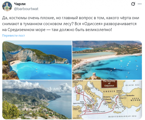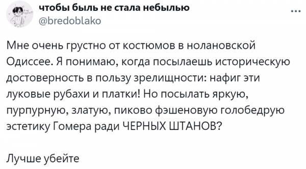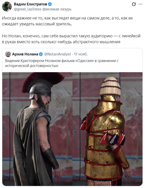 И вот Нолану дали "зелёный свет" на проект мечты, одну из первых и главных историй мира - "Одиссею" Гомера. Почти год режиссёр снимал картину, отсняв более 600 тыс. километров дорогущей плёнки IMAX. Странствия Одиссея (его сыграл Мэтт Деймон) снимали в основном на натуре, больше половины картины были сняты в водах Средиземного моря. Критики пишут, что эпический размах Нолана и его любовь к естественным декорациям и эпическая поэма Гомера идеально сочетаются и жалеют лишь о том, что на роль Циклопа мастер не взял Кристина Бейла, который для роли наверняка выколол бы себе один глаз и вырос на несколько метров.Недавно были опубликованы первые кадры картины. И интернетовские любители кино разнесли их в пух и прах. От Нолана ожидали исторической достоверности, а получили блёклую пародию на "Трою" с Брэдом Питтом (кстати, Нолан должен был снимать "Трою" в 2004 году, однако что-то не срослось, о чём постановщик впоследствии очень жалел).