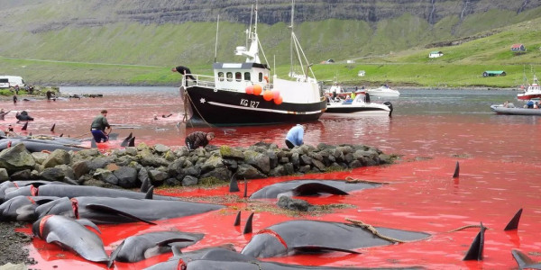 Охотники на Фарерских островах убили 175 китов-лоцманов, сделав море красным от крови после того, как лодки погнали животных к берегу, где люди ждали на мелководье с крюками, ножами и копьями.