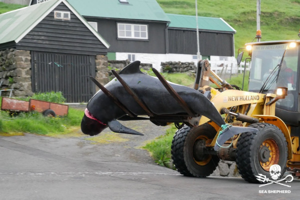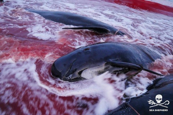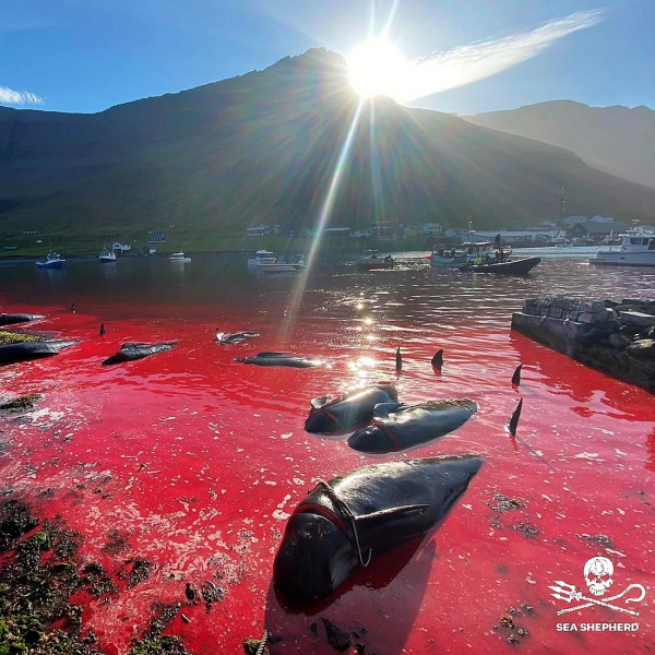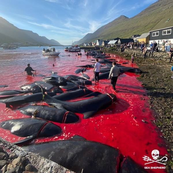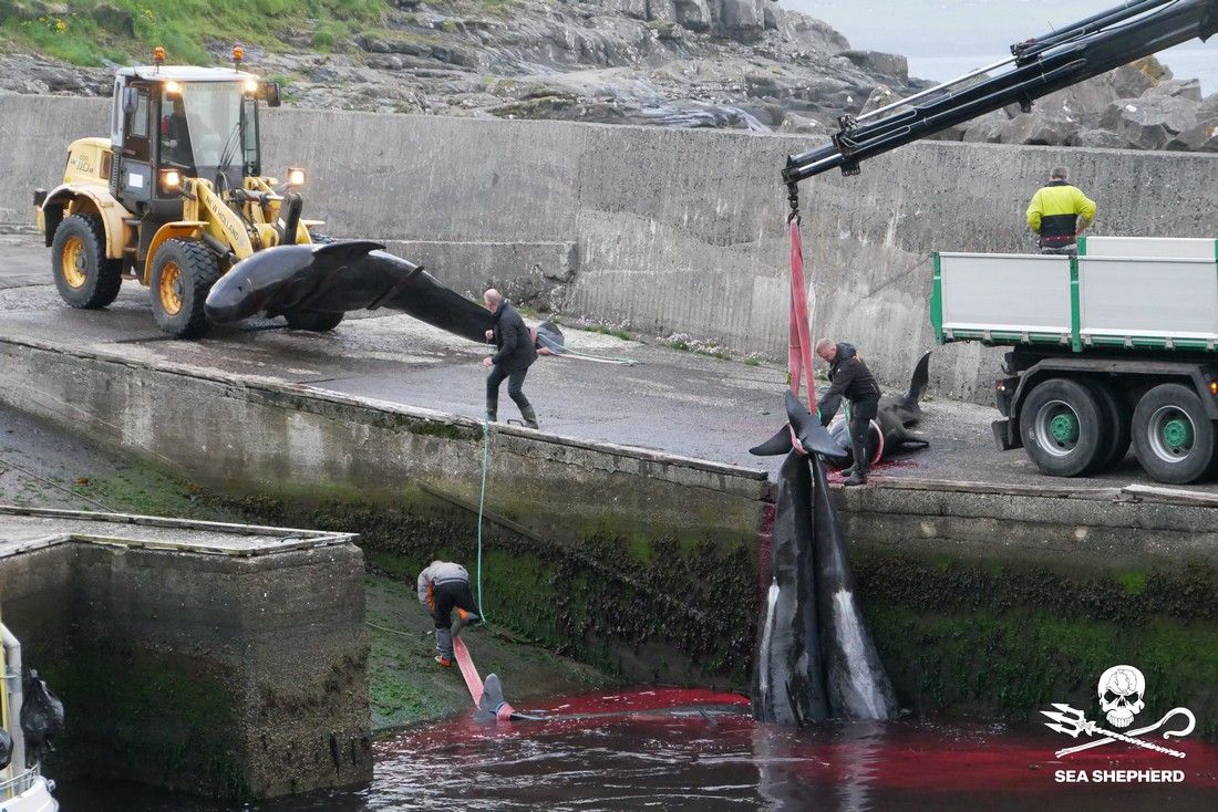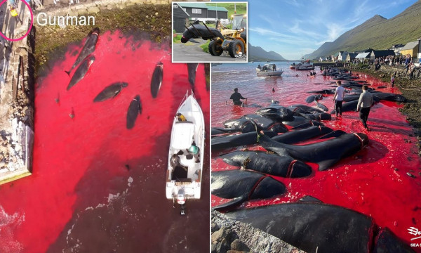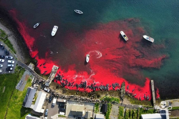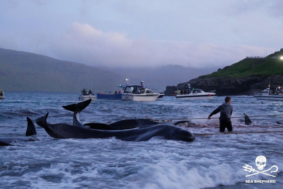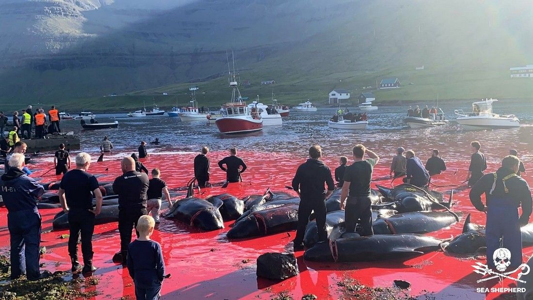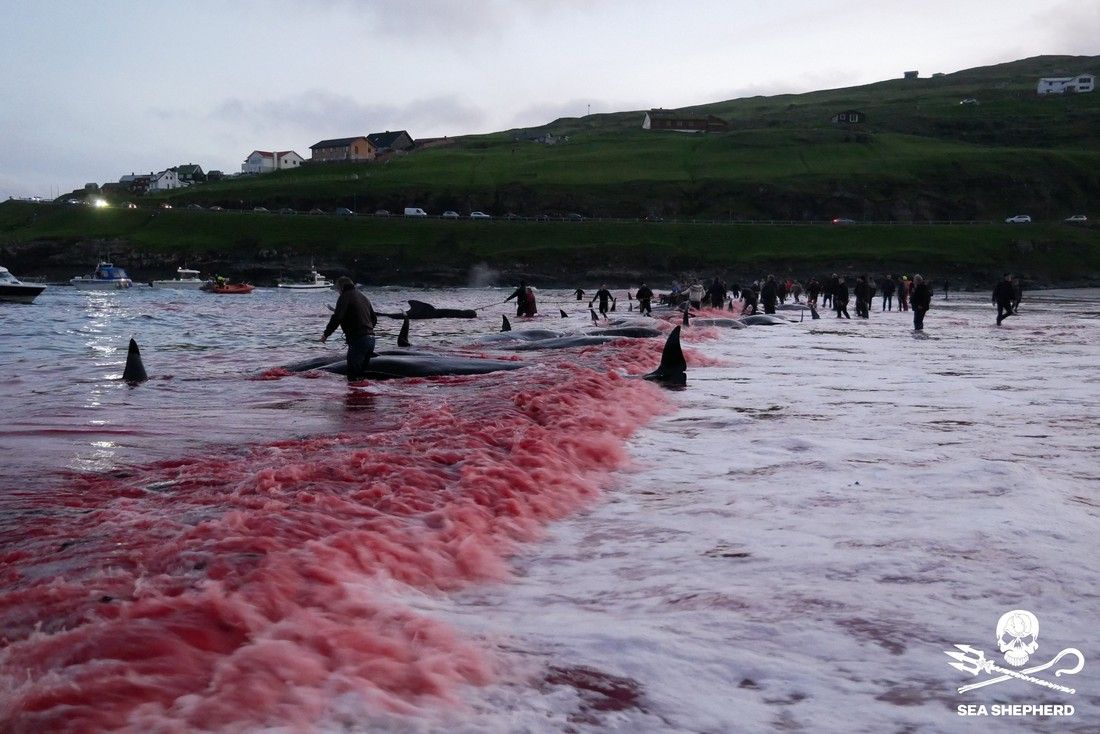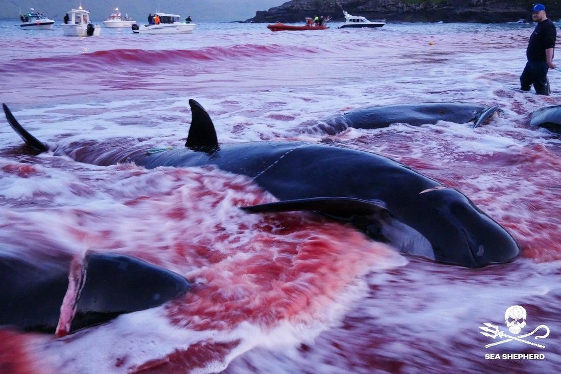 Охотник даже выстрелил из дробовика в беспилотник, который был послан морскими защитниками природы Sea Shepherd, чтобы задокументировать бойню, известную как Грайндадрап или Грайнд на фарерском языке.Фарерские острова разделены по этому вопросу, но многие призывают иностранные СМИ и неправительственные организации уважать их традиционную островную культуру, где рыболовство занимает центральное место, а все китовое мясо используется в качестве пищи.Sea Shepherd говорят, что практика, в результате которой за последнее десятилетие погибло более 6500 китов и дельфинов, является неприемлемой и "варварской".Ранним утром в воскресенье охотники схватили свои орудия убийства, багры, копья и ножи, когда они поспешно запрыгнули примерно в 20 лодок, которые умчались, чтобы загнать китовую стаю в загон к пляжу в Лейнаре. Там они убили 52 кита-лоцмана.Но это веселье затмится несколькими часами позже, когда у южного побережья будет замечена еще одна стая, и экипажи отправились, чтобы отвезти их в город Хваннасунд, где охотники убили 123 кита.