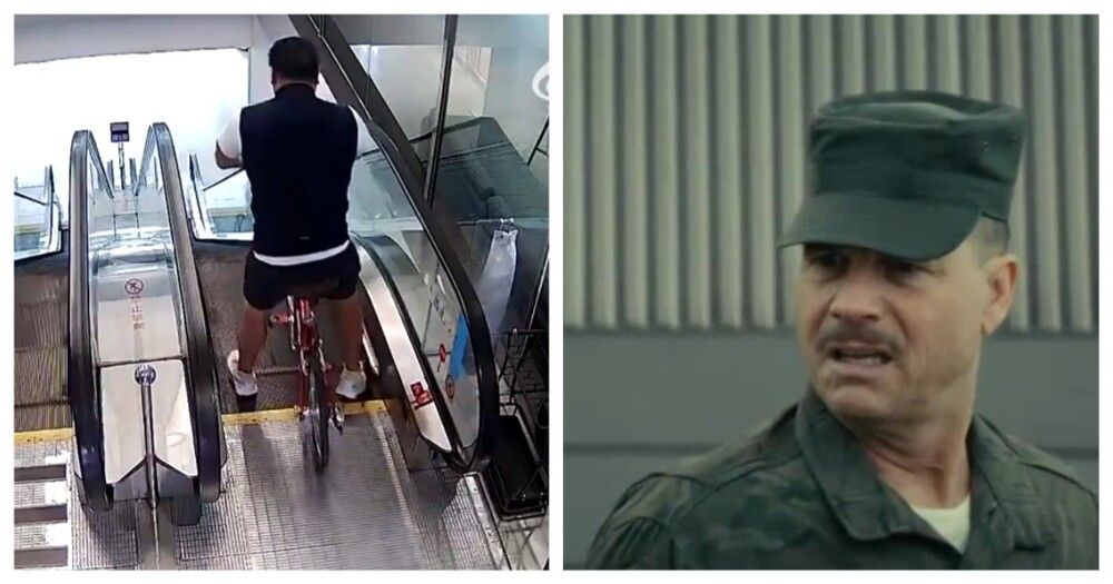 Житель Китая решил спуститься по эскалатору, не слезая со своего велосипеда. Итог: болезненное падение.