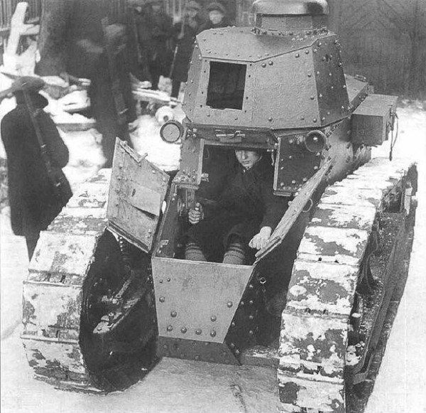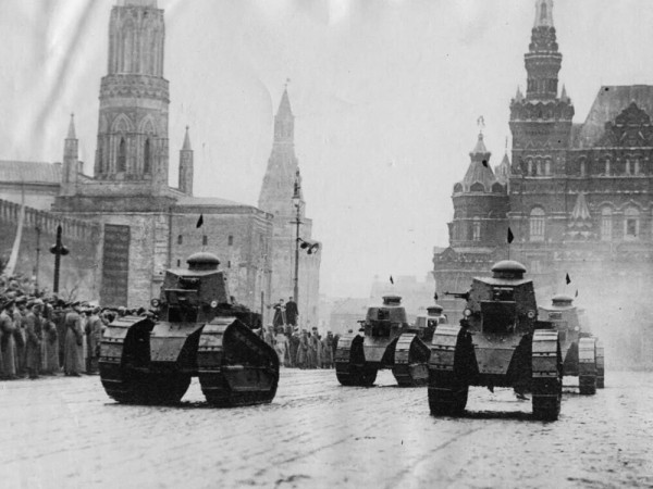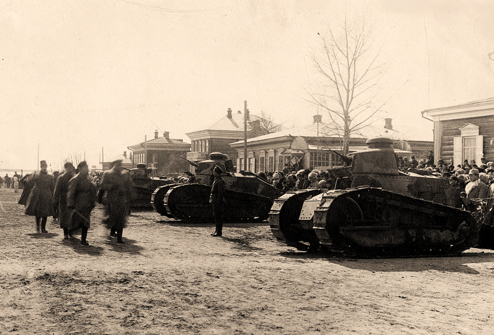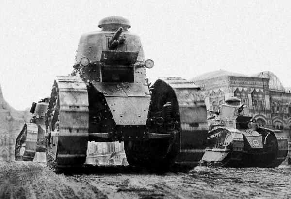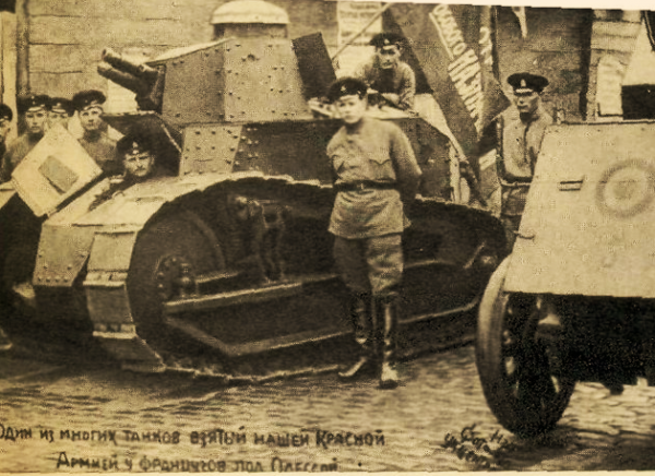 Французские легкие танки "Рено" FT-17 в Одессе в окружении французских и греческих солдат. В центре пушечный танк с литой башней. На консоли его шасси хорошо виден номер - 69009. Танк справа имеет клепаную граненую башню. Его номер неизвестен.Хотя Российская империя ещё до прихода к власти большевиков пыталась закупать танки во Франции. Сначала заказали 390 танков (штурмовых орудий) "Шнейдер CA1", но затем от них отказались, заказав такое же количество хорошо проявивших себя легких танков "Рено" FT-17. При этом Русское правительство в отличие от Правительства США не приобретало и не собиралось приобретать у французов лицензию на их производство. Но в октябре 1917 года в России произошла вторая за этот год революция. А в марте следующего года Советское правительство вышло из Первой Мировой войны. И заказанные Россией танки в неё не попали. И танки именно из 3-й роты 303-го полка штурмовой артиллерии и достались первыми советскому государству. Так вот 18 марта 1919 года 1-я Заднепровская бригада Н.А. Григорьева, из состава 2-ой Украинской Советской армии (2-я УСА) в бою с греко-французскими войсками под станцией Березовкой (недалеко от Одессы) захватили 4 танка. Один из трофейных танков было решено отправить в Москву в подарок товарищю Ленину к Дню всемирной солидарности трудящихся (1 мая). Привлекает внимание фигура комбрига Григорьева, которого советские историки обычно называли "атаманом". Григорьев - царский офицер, участник Русско-японской и Первой мировой войны, левый эсер, организатор повстанческой войны против австро-германских оккупационных войск, против войск Гетьмана Скоропадского, интервентов Антанты, ярый антисемит, прозванный "жидоедом". В феврале 1919 года он перешел на сторону Советской Украины и уже в этом качестве продолжил борьбу с интервентами. За подвиги в этой борьбе награжден орденом Красного знамени. В мае того же года возглавил антибольшевистское восстание, в ходе которого объединился с войсками другого красного командира - анархо-коммуниста Нестора Махно ("Батька Махно"), а в июле был убит якобы махновцами за связь с Деникиным и за еврейские погромы (Махно был активным противником антисемитизма!). Бригада Григорьева вместе со своим командиром прошла весь его боевой путь. Так вот, эти самые григорьевцы и воевали с греко-французскими войсками. Именно они и решили отправить один из захваченных ими французский танк товарищу Ленину. Но про григорьевцев мы ещё вспомним.Но первый присланный танк оказался "разукомплектованным" и не мог самостоятельно передвигаться. Причина тривиальная: при перевозке танка с него "свинтили" все, что имело хоть какую-то ценность. В итоге ни о каком параде не могло быть и речи. Пришлось телеграфировать командованию 2-ой Украинской советской армии (2-я УСА) просьбу срочно выслать второй трофейный танк "Рено" FT-17. Его незамедлительно выслали и второй танк смог пройти по Красной площади во время Первомайского парада. Это был первый танковый парад в российской истории.
