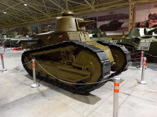 И в наше время, в современной России остался всего один танк. Что демонстрируется сейчас на Поклонной горе. Причём родной у него только корпус. Так как в 1938 году на полигон в Кубинке был доставлен корпус одного из первых трофейных танков типа "Рено" FT-17. Почему первых? А потому что с 1939 года пошла вторая волна трофеев этих машин. И именно с танка захваченного в Польше в 1939 года на него и установили башню. При этом ведущее колесо этого танка выполнено из дерева. Единственный случай применения этого материала в конструкции танков.