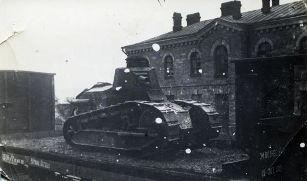 Захваченный красными белогвардейский танк "Рено" FT-17 в Вознесенске перед отправкой в Харьков. 1920 год.Но к этому моменту это были не единственные танки на территории России вообще. Во Владивосток в марте 1920 года, под видом "помощи Красного Креста", американские войска доставили 10 танков "Рено" FT-17, которые были перехвачены, прямо в вагонах, амурскими партизанами, отремонтированы, вооружены 37-мм пушкой или пулеметом и приняли ограниченное участие в боях 1921 г. При этом партизаны их называли "таньками". Но до 1922 г. в исправном состоянии здесь дожил только один танк. Остальные были разбиты и требовали ремонта. И были вывезены в Советскую Россию. В тот же Харьков.