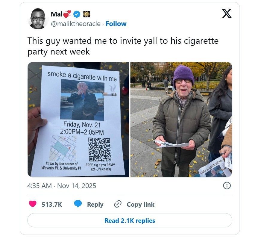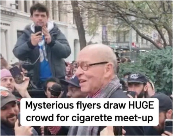 Он рассчитывал человек на десять, максимум двадцать таких же стариков, которые ещё помнят вкус настоящего Marlboro. Но Нью-Йорк - это место, где если позвать на бесплатное что угодно, прибегут все. В назначенный день и час на перекрёстке собралось покурить около 2500 человек. Молодёжь в пуховиках, тётки с собаками, студенты, офисные клерки, даже туристы.