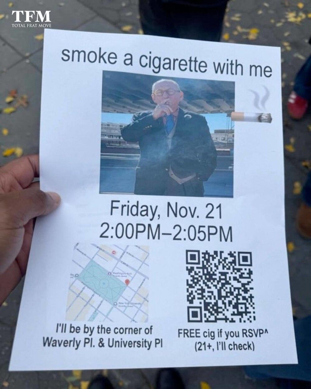 Деду 74 года исполнилось, а друзей всё меньше: кто умер, кто бросил курить, кто переехал в Флориду умирать там потеплее. И вот однажды Боб взял стопку ярких флаеров, написал на них крупными буквами "Эй, куришь? Приходи 21 ноября в 14:00 на угол Waverly и University - закурим вместе и поболтаем", и расклеил по всему Манхэттену.