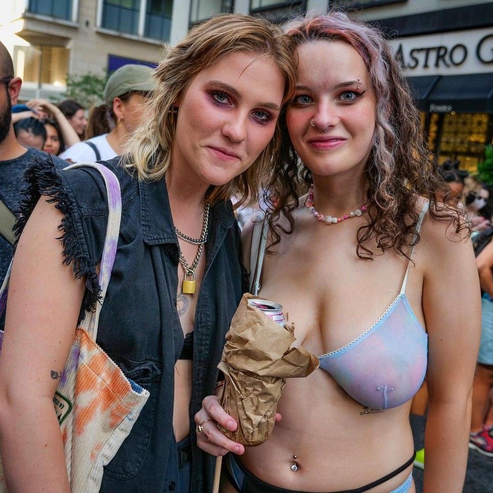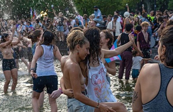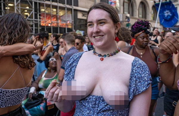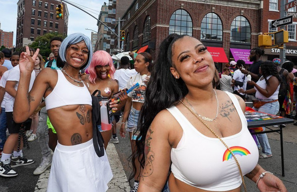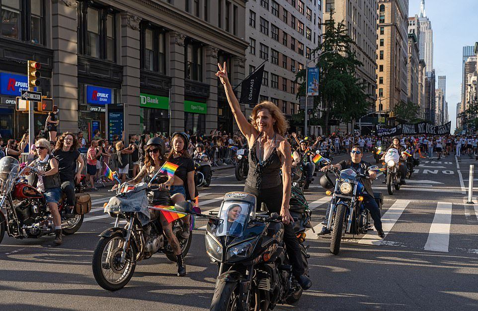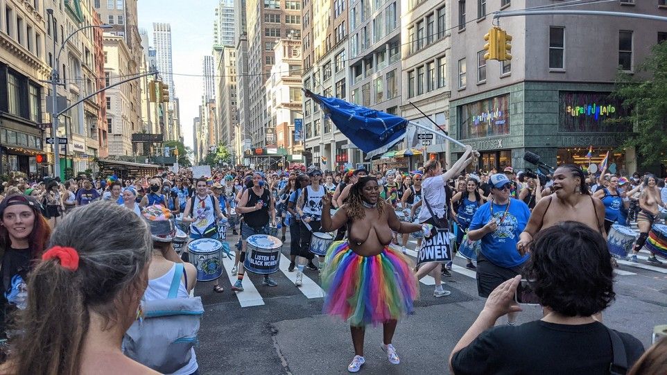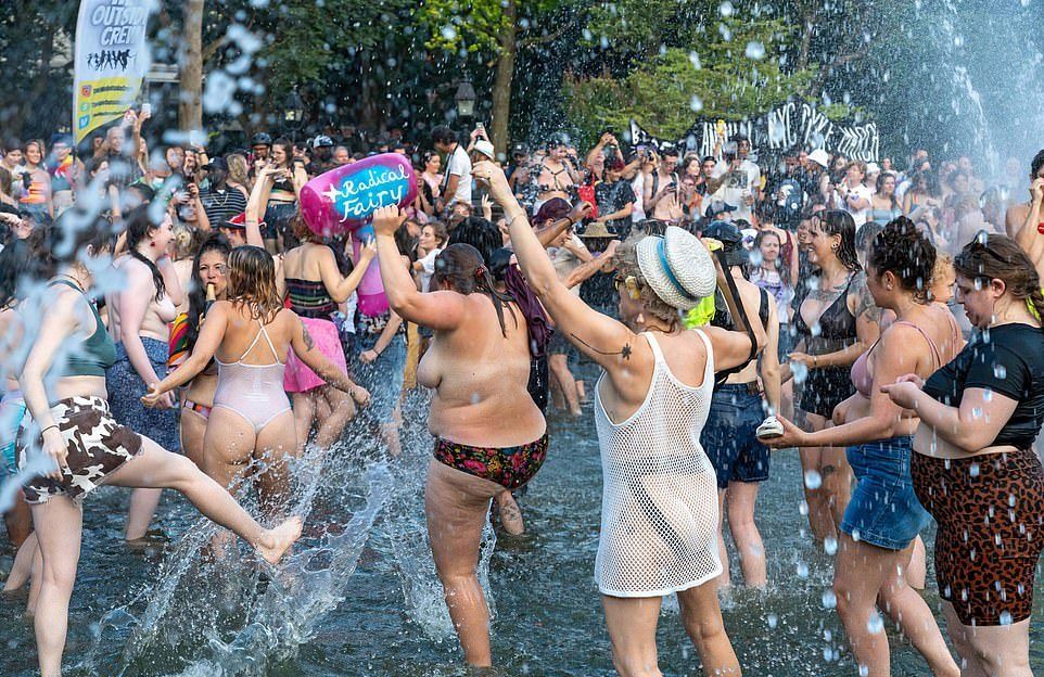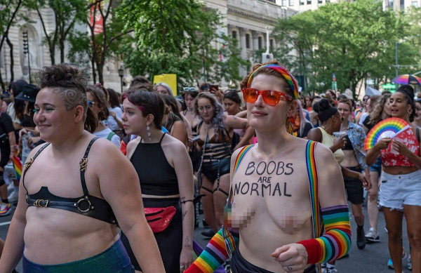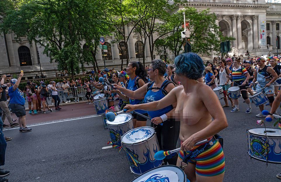 Главная цель Марша лесбиянок - поощрение активности в лесбийском сообществе. Он начался в Брайант-парке и завершился в парке Вашингтон-сквер, где пары плескались в фонтане и обнимались.Когда-то в Нью-Йорке было незаконно ходить топлесс, пока Апелляционный суд 1992 года не отменил запрет на закон штата, если нагота не использовалась в коммерческих целях.Для некоторых участников кампании демонстрация груди на публике является формой протеста, направленной на отстаивание права женщин одеваться так, как они хотят.Главный парад гордости в воскресенье рекламируется как виртуальное мероприятие с маршем меньшего масштаба через три квартала. Организаторы предсказывают, что "миллионы" будут смотреть его по телевизору.