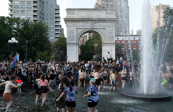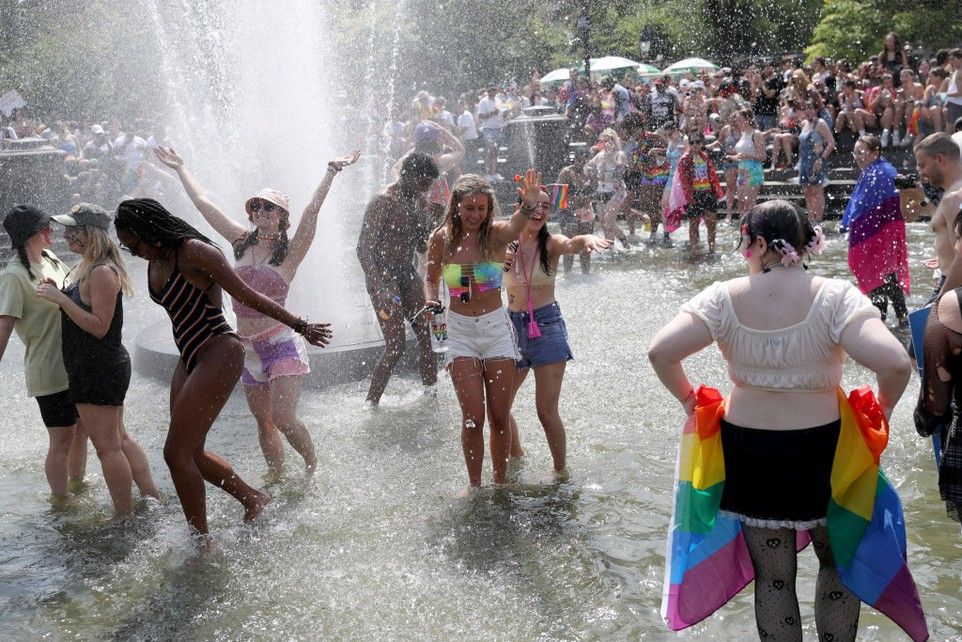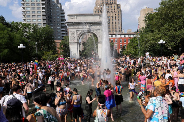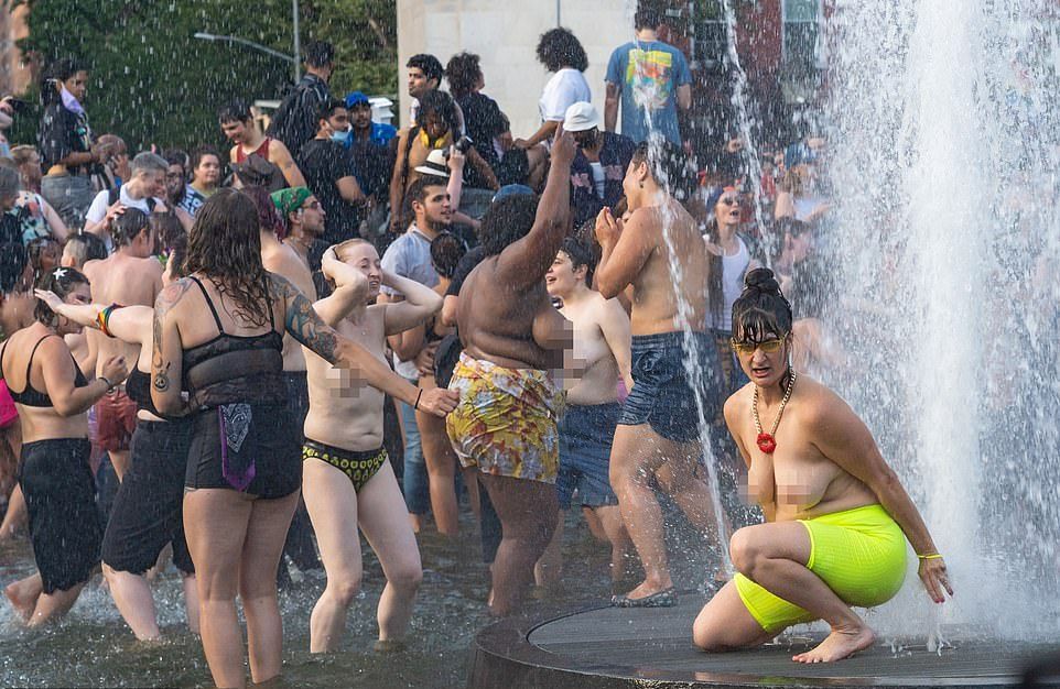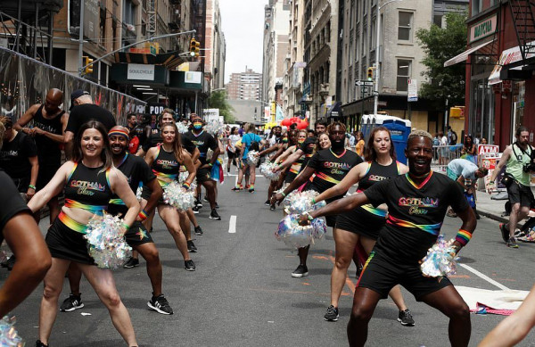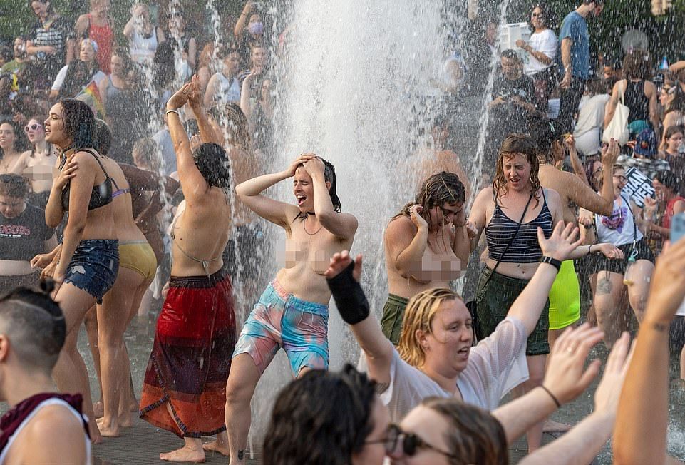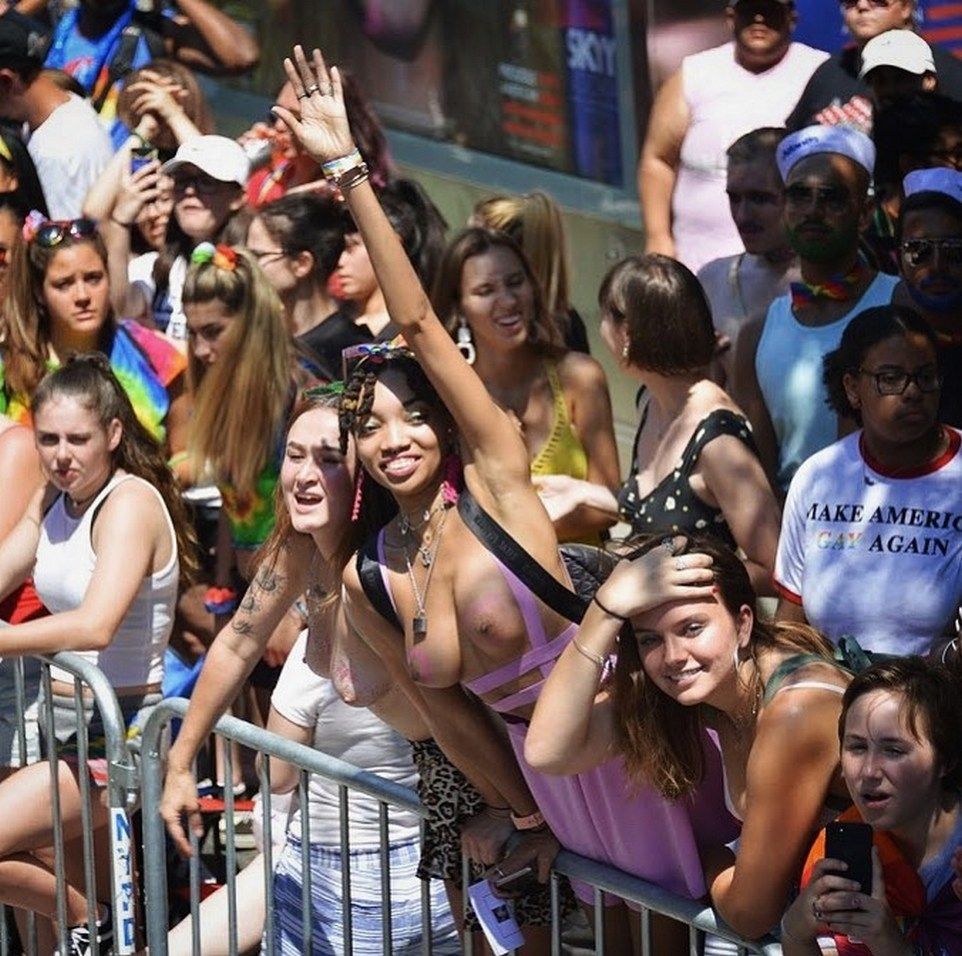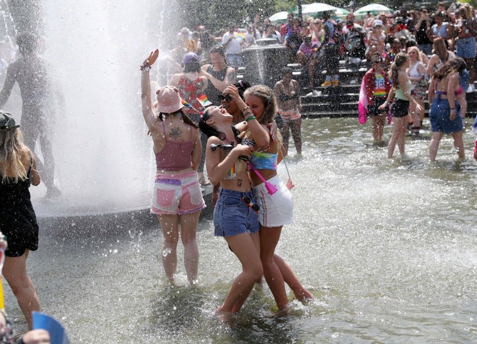 Главная цель Марша лесбиянок - поощрение активности в лесбийском сообществе. Он начался в Брайант-парке и завершился в парке Вашингтон-сквер, где пары плескались в фонтане и обнимались.Когда-то в Нью-Йорке было незаконно ходить топлесс, пока Апелляционный суд 1992 года не отменил запрет на закон штата, если нагота не использовалась в коммерческих целях.Для некоторых участников кампании демонстрация груди на публике является формой протеста, направленной на отстаивание права женщин одеваться так, как они хотят.Главный парад гордости в воскресенье рекламируется как виртуальное мероприятие с маршем меньшего масштаба через три квартала. Организаторы предсказывают, что "миллионы" будут смотреть его по телевизору.