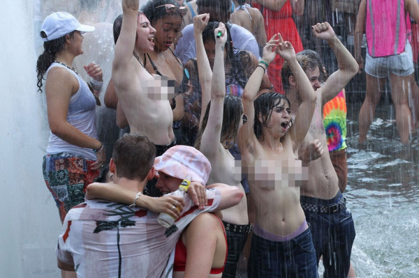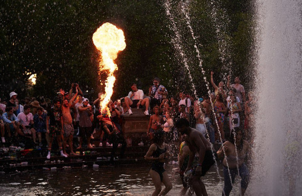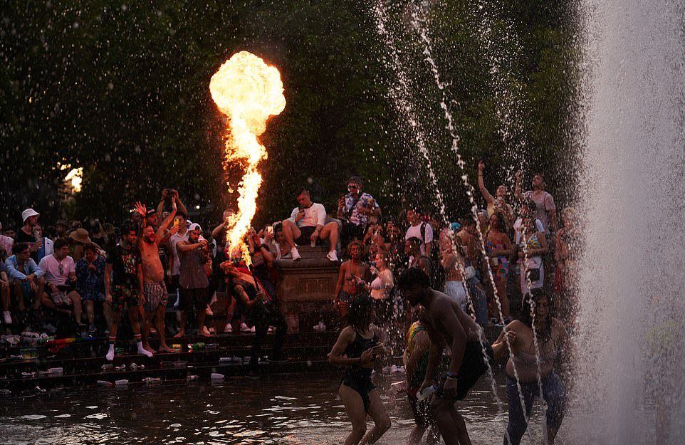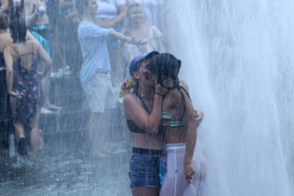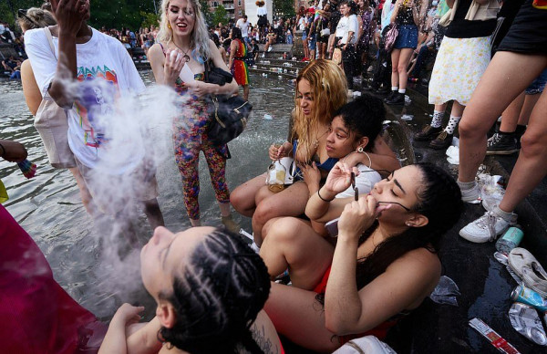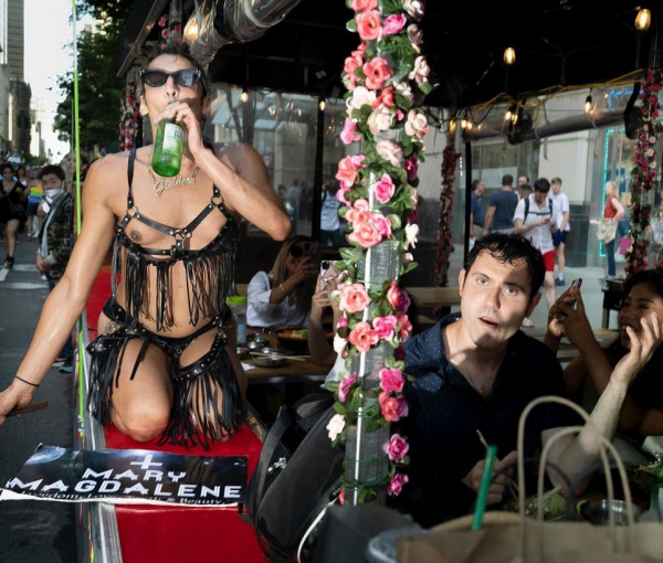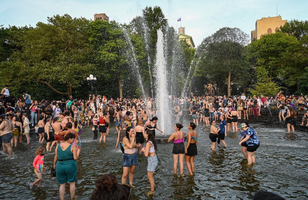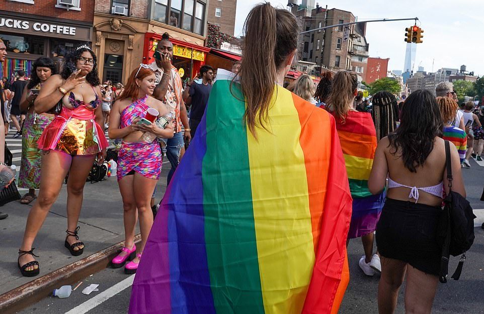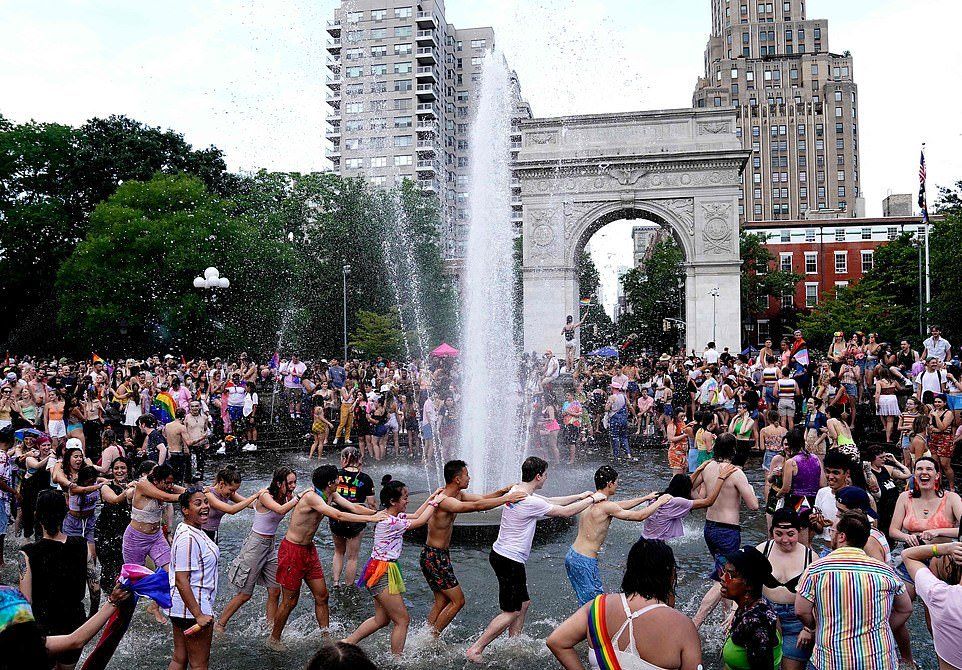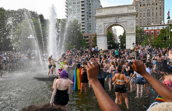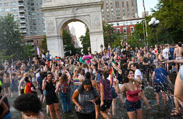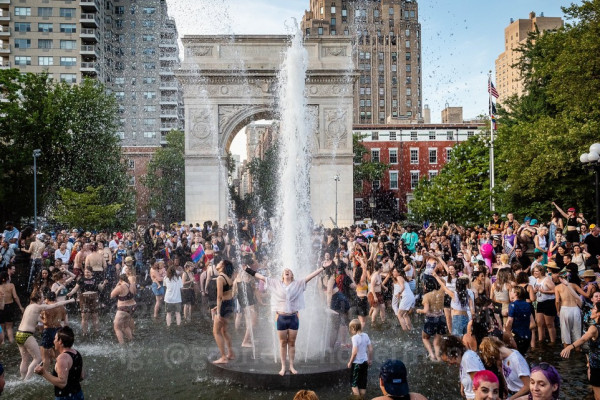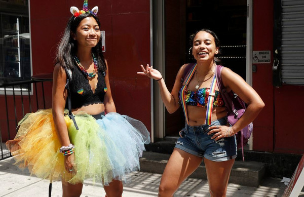 Главная цель Марша лесбиянок - поощрение активности в лесбийском сообществе. Он начался в Брайант-парке и завершился в парке Вашингтон-сквер, где пары плескались в фонтане и обнимались.Когда-то в Нью-Йорке было незаконно ходить топлесс, пока Апелляционный суд 1992 года не отменил запрет на закон штата, если нагота не использовалась в коммерческих целях.Для некоторых участников кампании демонстрация груди на публике является формой протеста, направленной на отстаивание права женщин одеваться так, как они хотят.Главный парад гордости в воскресенье рекламируется как виртуальное мероприятие с маршем меньшего масштаба через три квартала. Организаторы предсказывают, что "миллионы" будут смотреть его по телевизору.