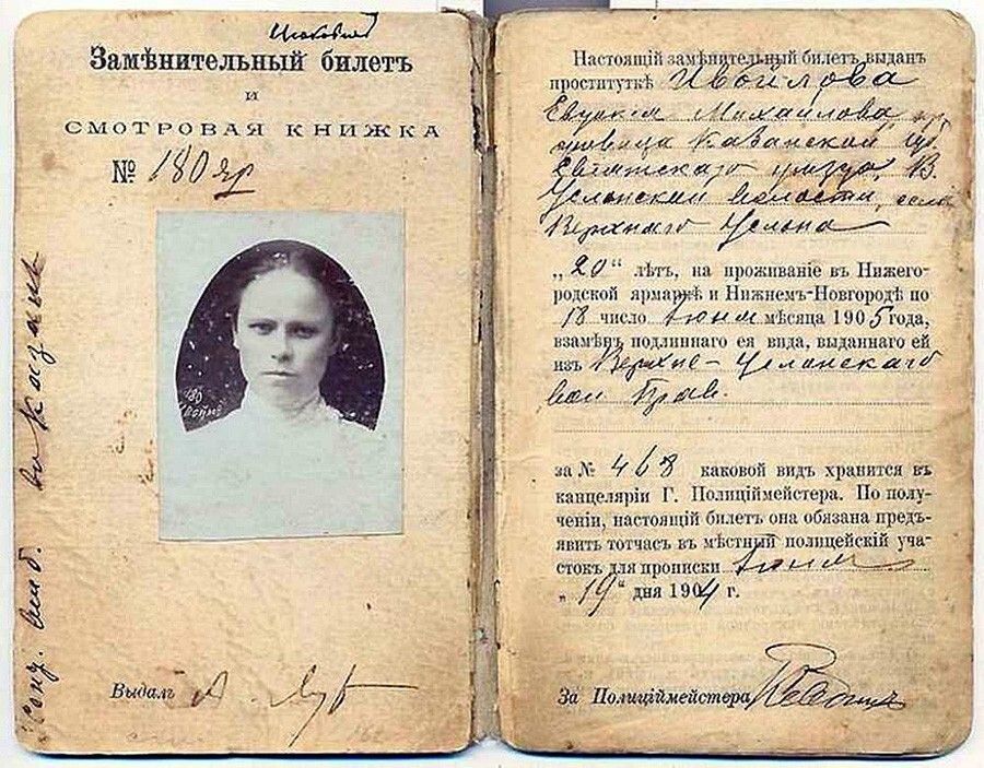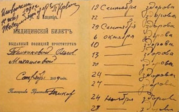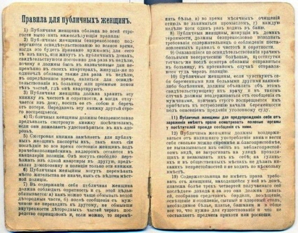 Публичный дом в царской России был заведением серьезным. Действовал запрет на любые вывески, а расстояние от него до церквей, школ и училищ должно было быть "достаточно большим". Внутри публичного дома разрешалось иметь пианино и играть на нем. Все остальные игры были запрещены, особенно настороженно упоминались тут шахматы. Также было запрещено украшать дом портретами царственных особ.Делились бордели на три категории: высшая оплата до 12 рублей (не более 7 человек в сутки), средняя до 7 рублей (до 12 человек), низшая до 50 коп. (до 20 чел. в сутки). Неисполняющих требования проституток заключали под стражу в "Калинкин дом".Так как проституция считалась официальной профессией, то публичные дома облагались налогом. Оговаривался и расчет за услуги: 3/4 полагались хозяйке, 1/4 - девушке. Правила эти, скорее всего, соблюдались когда как.Из Правил содержательницам борделей, утвержденных министром внутренних дел 29 мая 1844 года:1. Бордели открывать не иначе как с разрешения полиции.2. Разрешение открыть бордель может получить только женщина от 30 до 60 лет, благонадежная.8. В число женщин в бордели не принимать моложе 16 лет...10. Долговые претензии содержательницы на публичных женщин не должны служить препятствием к оставлению последними бордели...15. Кровати должны быть отделены или легкими перегородками, или, при невозможности сего по обстоятельствам, ширмами...20. Содержательница подвергается также строгой ответственности за доведение живущих у ней девок до крайнего изнурения неумеренным употреблением...22. Запрещается содержательницам по воскресным и праздничным дням принимать посетителей до окончания обедни, а также в Страстную неделю.23. Мужчин несовершеннолетних, равно воспитанников учебных заведений ни в коем случае не допускать в бордели.Билетным предписывалось посещать баню, не уклоняться от медицинского освидетельствования, и ни в коем случае не использовать косметики.Власти были к ним лояльны: в кабинеты для осмотра разрешали приходить под вуалью, а в документе 1888 года, переизданном в 1910 году, инструкции Министерства Внутренних Дел для чинов сыскных отделений говорилось: п. 18 " ...каждый чин сыскной полиции при исполнении ... должен быть с лицами женского пола вежлив, серьезен и сдержан в особенности".Проститутки были не просто "жертвами общественного темперамента", они составляли особый разряд общества - так называемых "разрядных женщин". Хочешь заниматься первой древнейшей профессией - на здоровье, но будь любезна встать на учет в полиции, сдать паспорт, а вместо него получить знаменитый "желтый билет" - официальное свидетельство того, что эта женщина больше не относится к числу "порядочных", скатившись в категорию отверженных обществом, и что полиция не только может, но даже обязана регулярно организовывать медицинские осмотры.Стать жертвой этого порядка можно было очень легко - для этого достаточно попасться хотя бы раз с клиентом при полицейской облаве или просто по доносу квартирохозяина - и все, путь назад, к обычным людям был отрезан. Имея на руках желтый билет, женщина имела право зарабатывать на жизнь только одним способом - своим телом. Вернуть себе паспорт обратно было довольно сложно, да и незачем - кому нужна была бывшая "гулящая". Так что, как правило, попавшие в этот капкан женщины профессию не меняли до самого своего конца, и ча