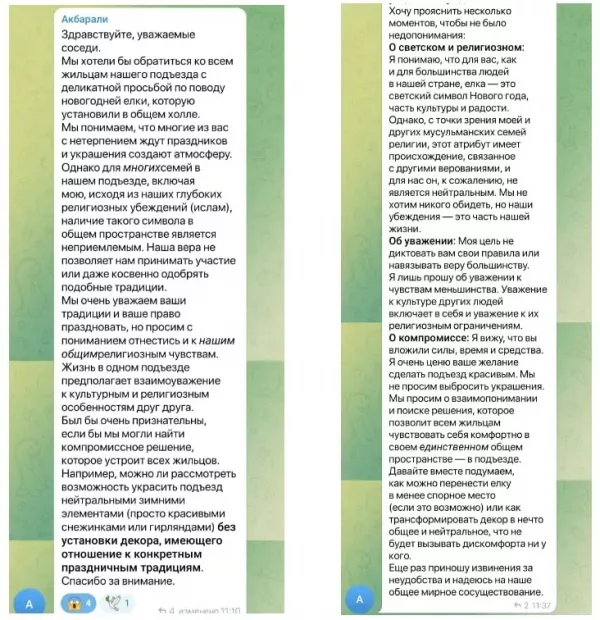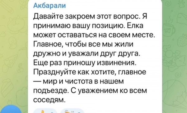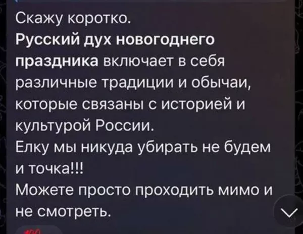 В одной из московских многоэтажек разгорелся настоящий скандал из-за новогодней ёлки. Жильцы решили создать праздничное настроение уже сейчас и установили в подъезде красавицу ёлку в нарядном убранстве. Однако эта инициатива понравилась не всем. В домовом чате появился сосед по имени Акбарали, который попросил убрать ёлку из-за своих религиозных взглядов. Мужчина пояснил, что мусульмане не празднуют Новый год. Более того, им даже нельзя смотреть на новогодние символы, каковым является пресловутая ель. Чтобы уважить мусульманские традиции, жилец попросил убрать дерево в праздничном наряде.