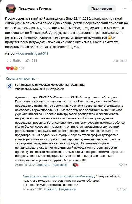 В Гатчинской межрайонной больнице разгорелся скандал после того, как рентгенолог прервал прием пациентов, чтобы совершить намаз. Очевидцы рассказали, что в очереди в приемном покое в этот момент находились дети с травмами после соревнований по рукопашному бою и несколько взрослых, включая пациента с открытой раной и венозным кровотечением.Администрация больницы признала, что врач самовольно покинул рабочее место без согласования замены, что нарушает внутренние регламенты. Вместе с тем руководство заявило о необходимости "компромисса" и объявило о пересмотре графиков дежурств с учетом религиозных потребностей персонала, а также о введении четких правил замещения сотрудников на время совершения религиозных обрядов.