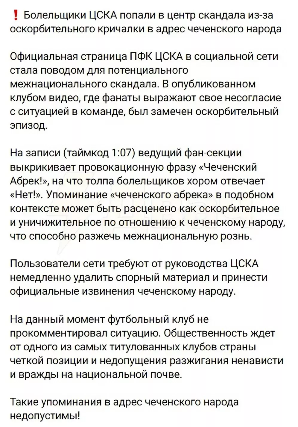 А вообще, в последнее время чеченцы стали слишком обидчивы. Не так давно они потребовали извинений у футбольного клуба ЦСКА за кричалку, в которой есть фраза про "абрека".