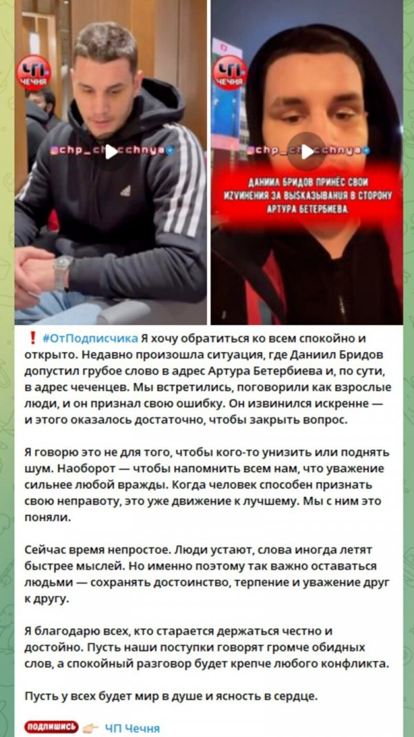 В сети появился ролик годичной давности, в котором Даниил Бридов во время просмотра поединка назвал Артура Бетербиева "чуркой". И хотя боец уже несколько раз извинялся за свои слова, чеченцы продолжали негодовать и даже навестили спортсмена, чтобы прояснить ситуацию.