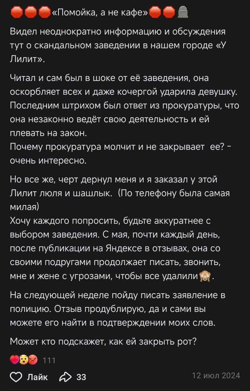 В Ярославле разгорается скандал после публикации о женщине, которая угрожает преподавателю за плохие оценки своей дочери. Дама наведалась в школу и попросила передать педагогу, что "задушит её, как курицу". "Поймаю её рядом со школой, голову - об стенку, и она сдохнет" - такое послание преподаватель математики получил от Лилит Мстоян, недовольной тройкой за контрольную.В Ярославле эту скандальную даму знают многие. В выражениях и действиях Лилит отнюдь не стесняется. Ниже на видео она общается с представителем мэрии, который принёс ей предписание.В местных СМИ сообщается, что жители Ярославля ранее подали в полицию более 300 заявлений на эту дебоширку, но реакции так и не последовало. Кстати, сама Мстоян активно строчит заявления в полицию и прокуратуру по любому поводу, и ярославцы боятся с нею связываться.Грязноротая мадам держит в городе кафе с характерным названием "У Лилит" - в отзывах к заведению тоже можно почерпнуть немало интересного о характере его владелицы.