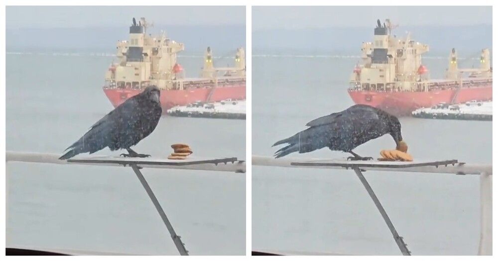 Ворона (или ворон) решила устроить себе сладкий перекус. Она стащила несколько печенек, однако унести их всех оказалось довольно сложно.